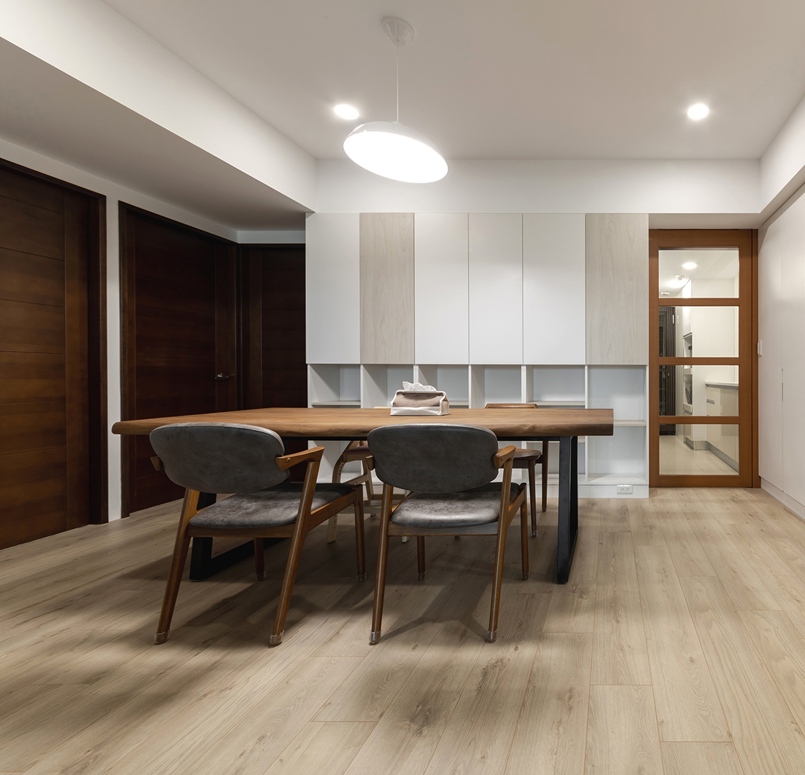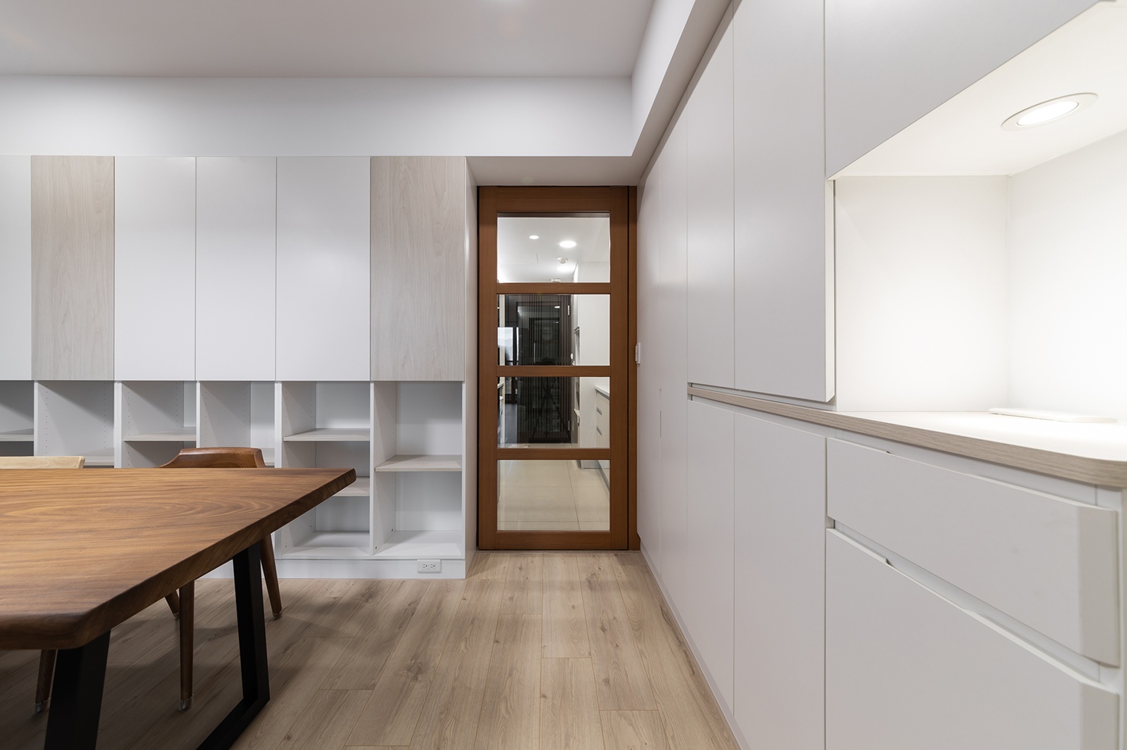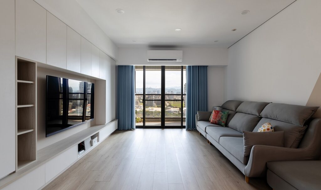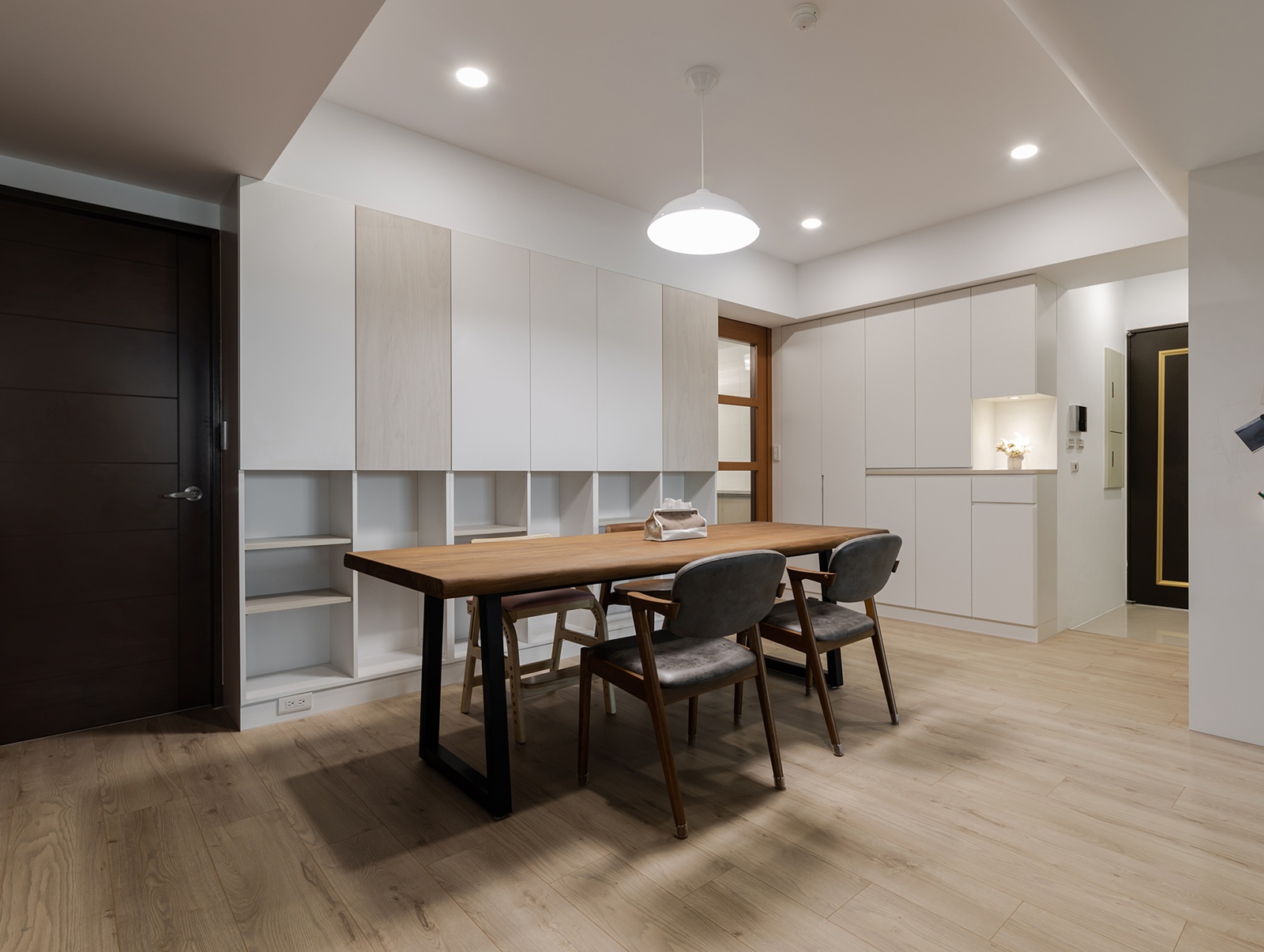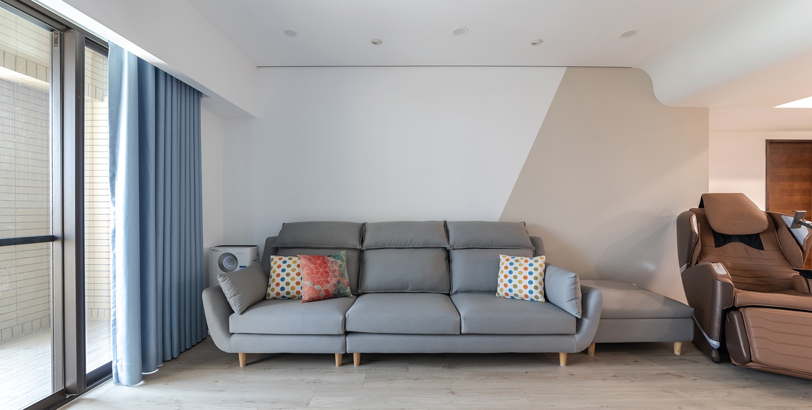 本案為住宅空間設計,設計理念以現代簡約為主軸。空間色調輕柔和煦,白、米色與淺木紋交織,明亮中帶有細膩層次,使氛圍如同日光灑落般舒適寧靜。設計重點包括弧形天花板、磁性塗鴉牆及格柵汙衣櫃,大量隱藏收納不僅擴展空間使用,使孩子能自在玩耍,大人生活更顯從容,讓幸福成為日常流動的旋律。