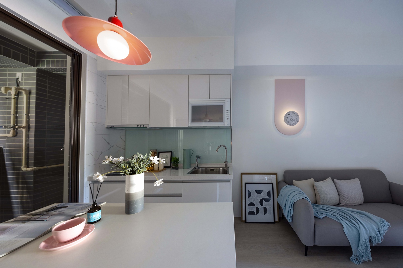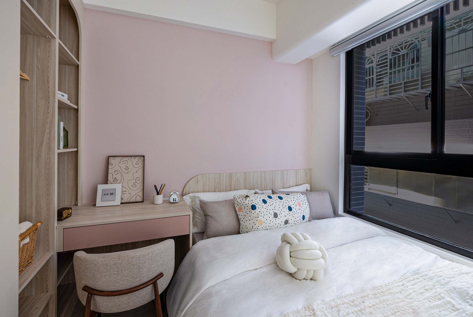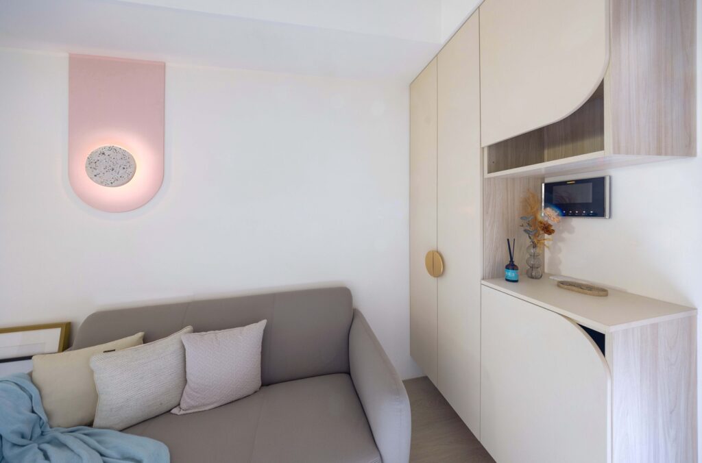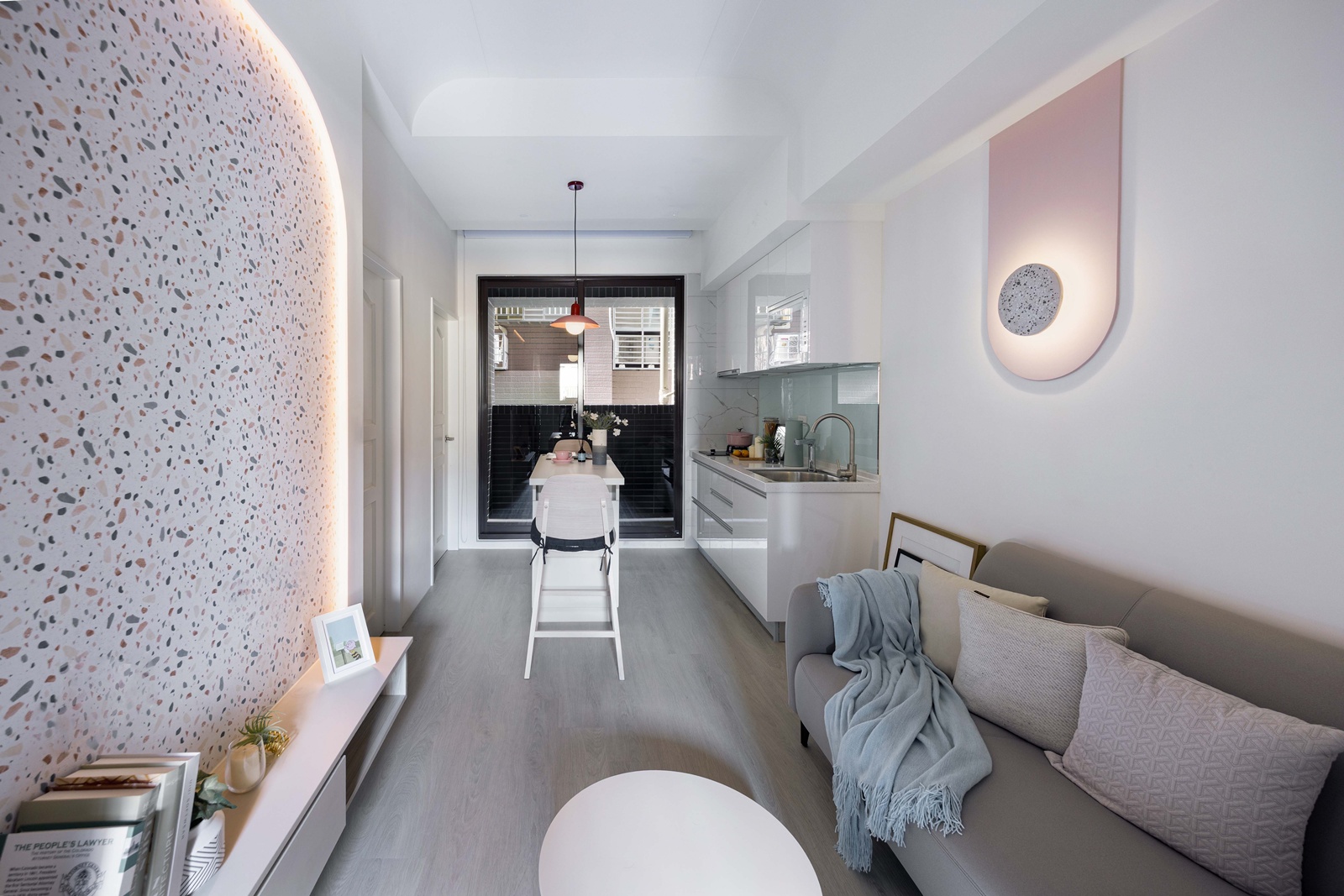 整室以北歐奶茶風為主軸,柔和的配色與圓拱造型在光影間交織,展現輕盈而自在的小宅氛圍。