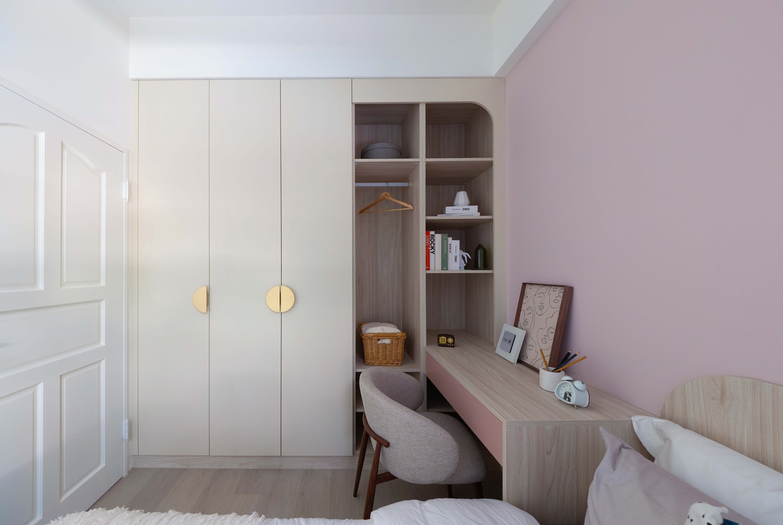 上下分門的衣櫃設計增添收納層次,呼應圓潤線條的語彙,讓空間溫柔而有韻律。