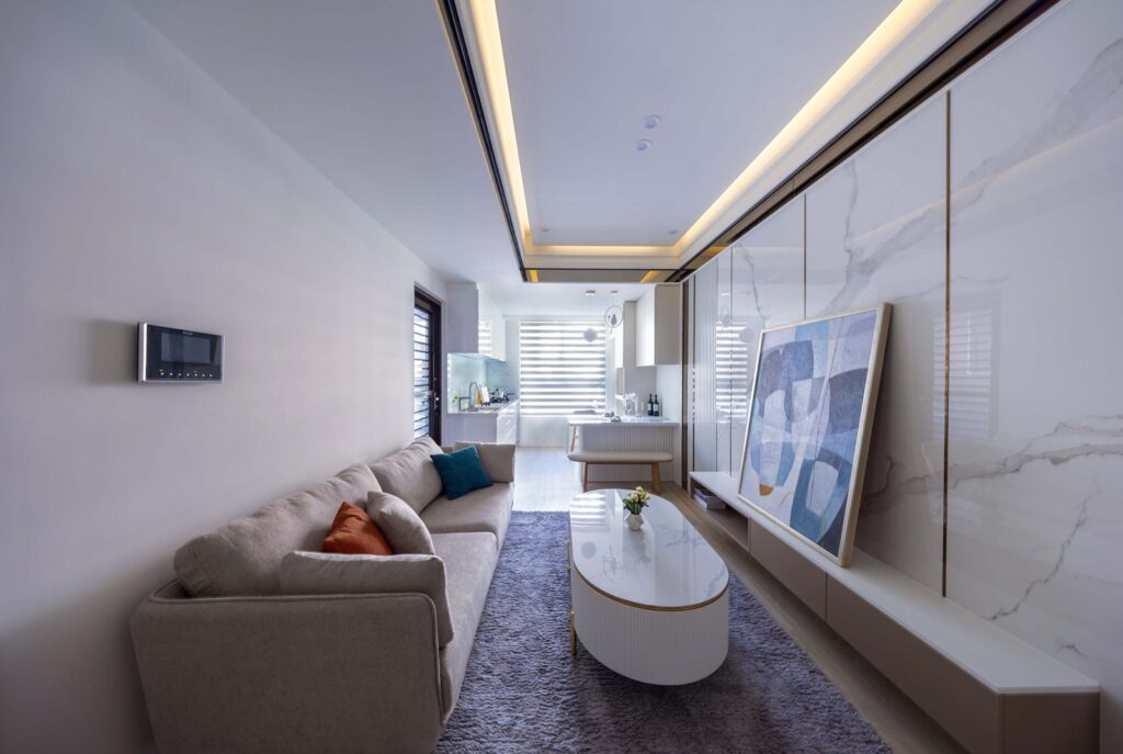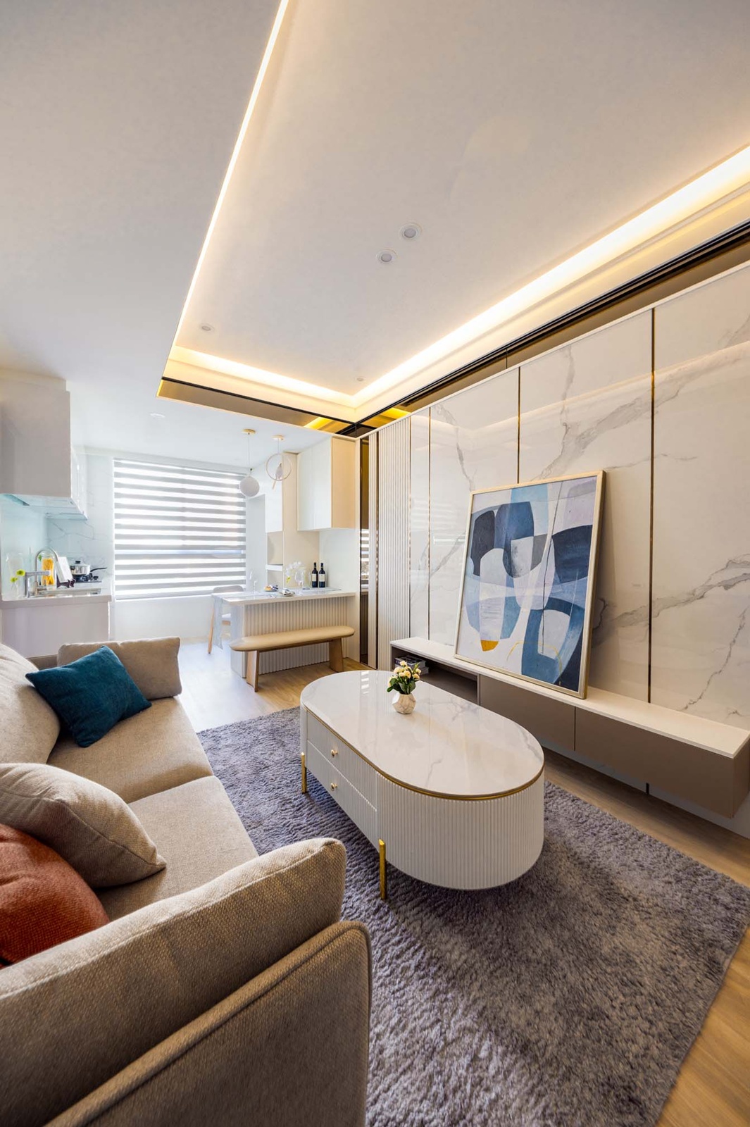 電視牆以大理石紋理搭配金屬飾條,體現輕奢的秩序之美。