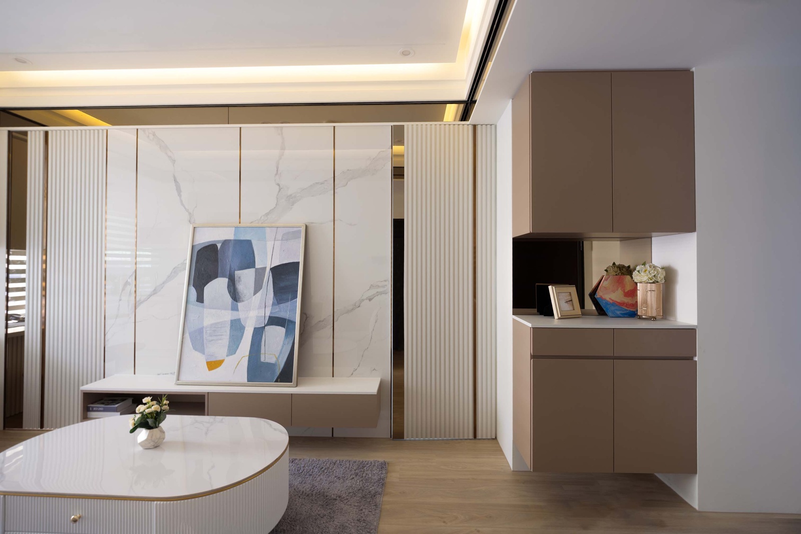 以灰白與木色為基底,融入俐落線條與功能櫃體。