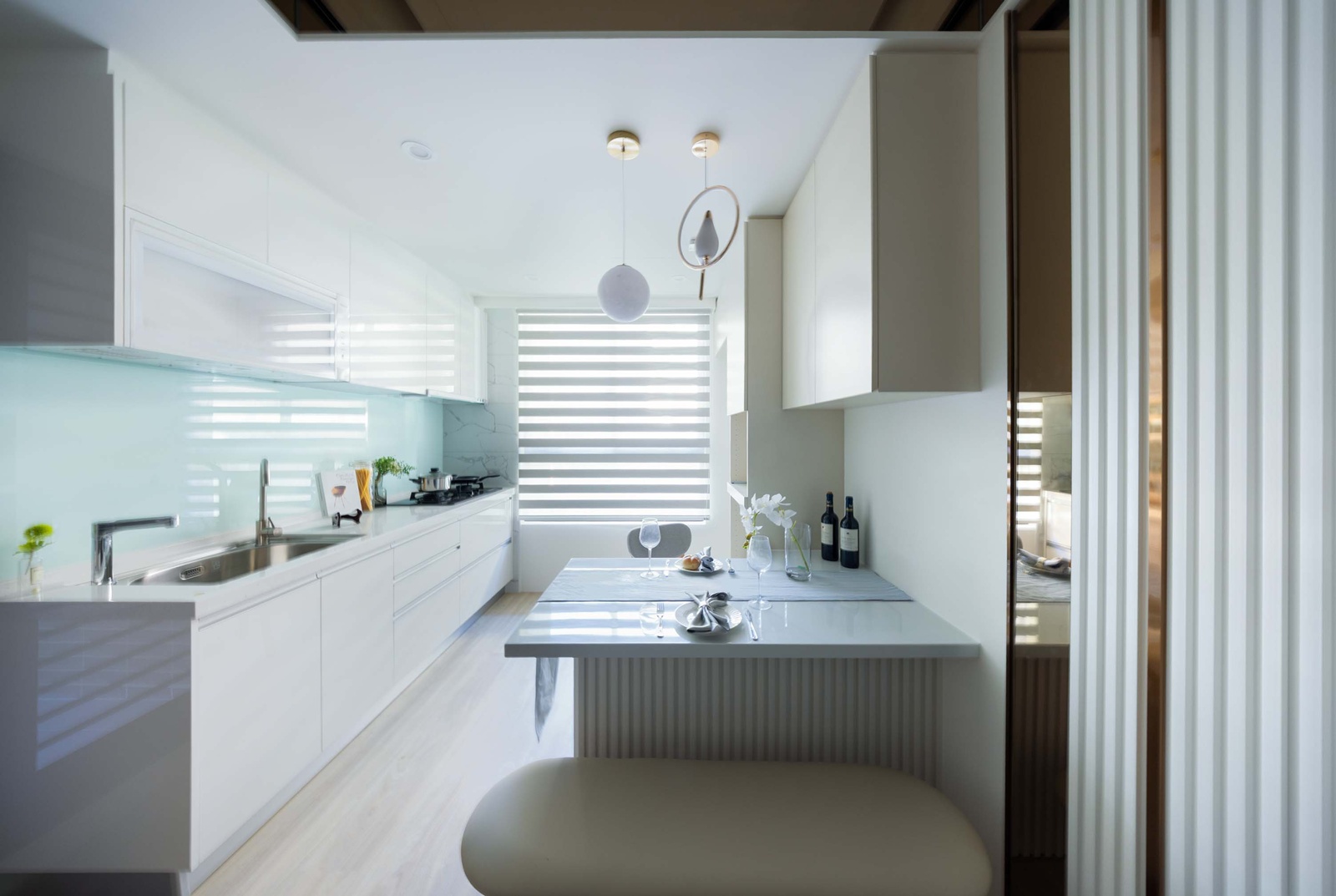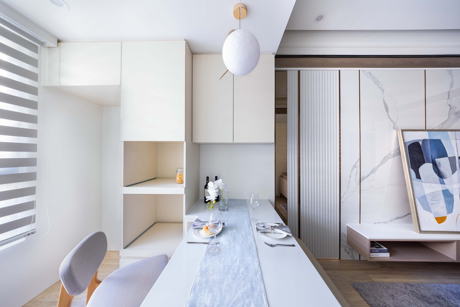 上方吊燈映照白色檯面,輕盈卻具層次。櫃體內藏收納機能,讓每一次用餐都更顯從容。