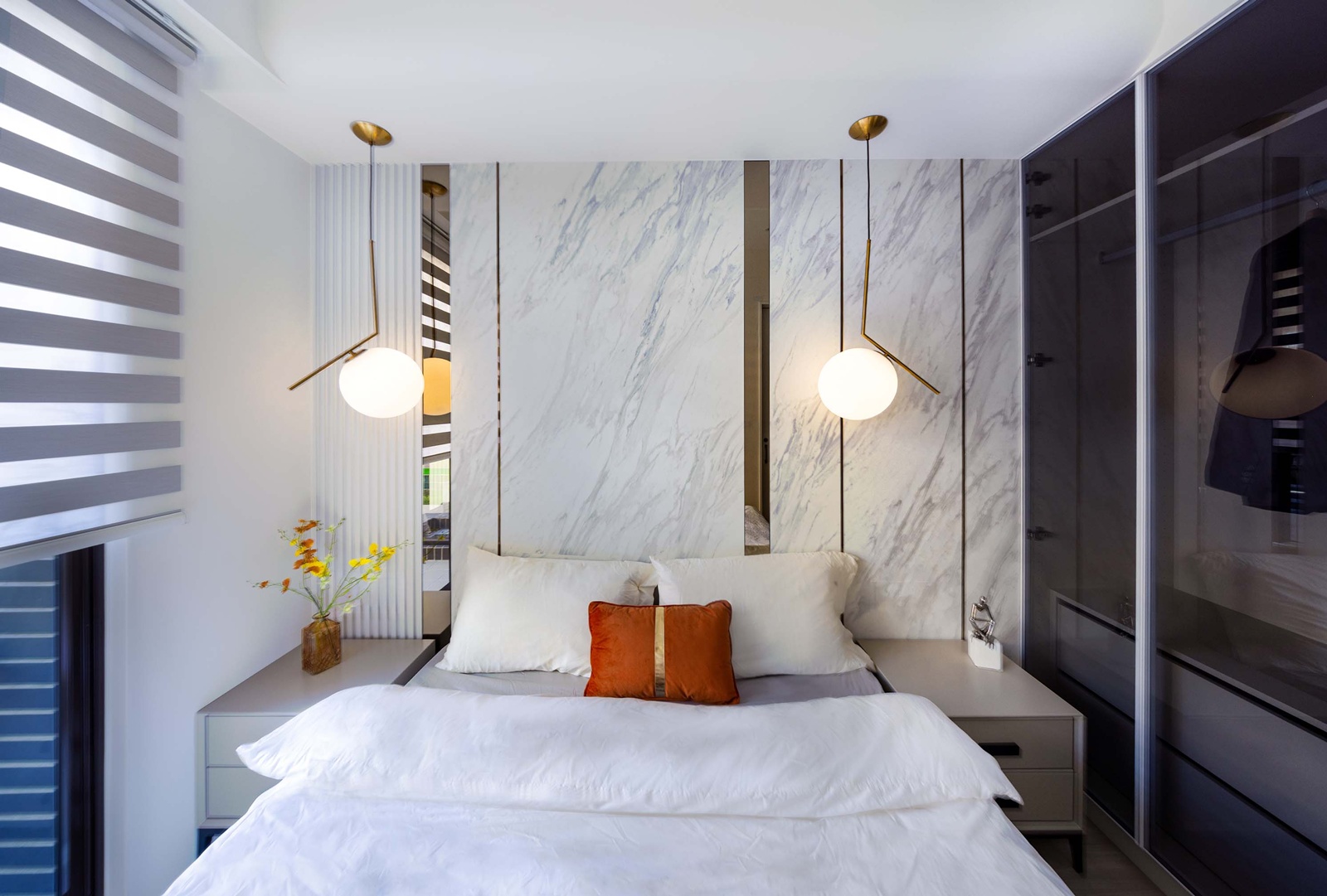 主臥延續大地色與石紋質感,床頭牆以垂直線條與金屬飾邊構築典雅比例。