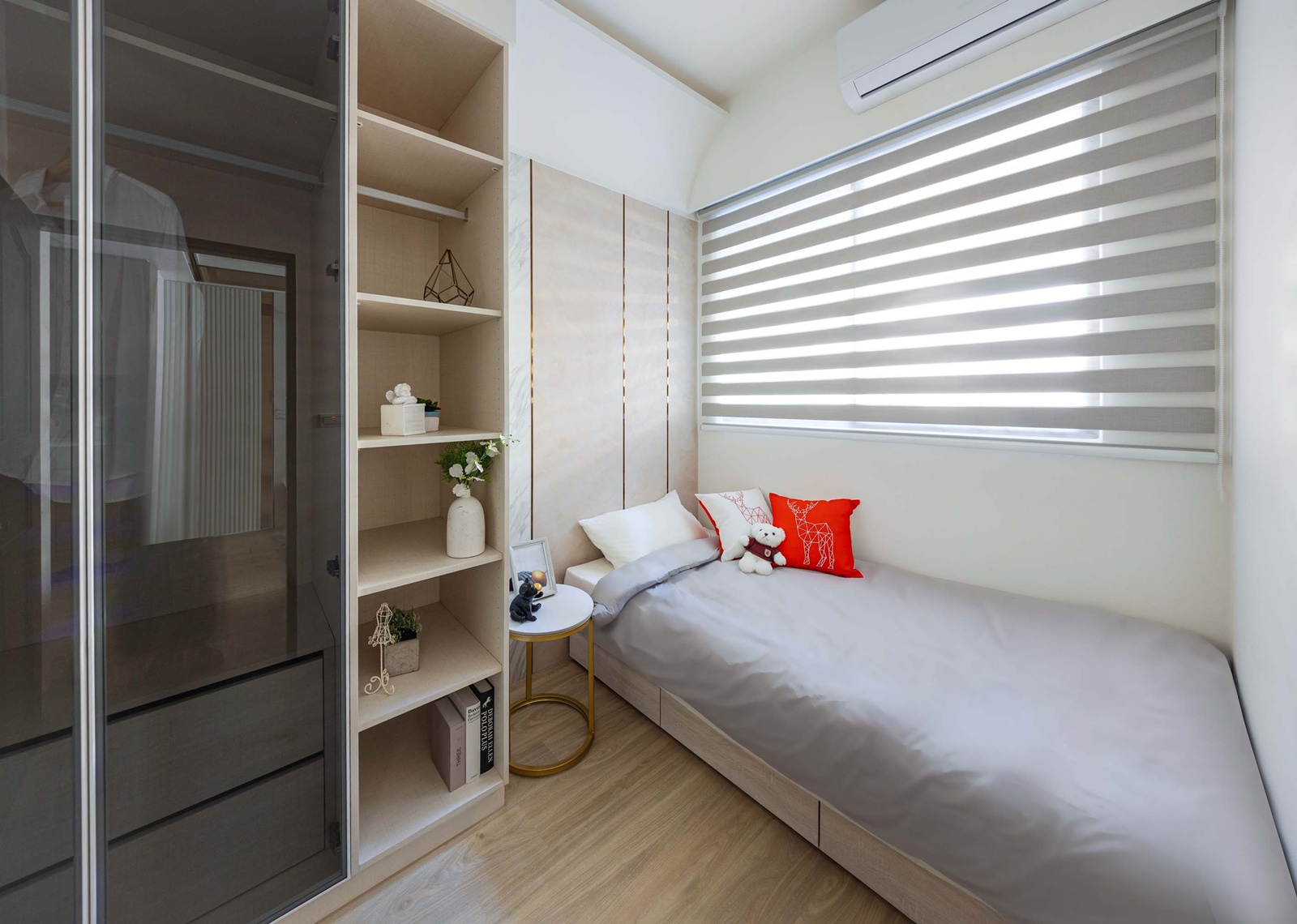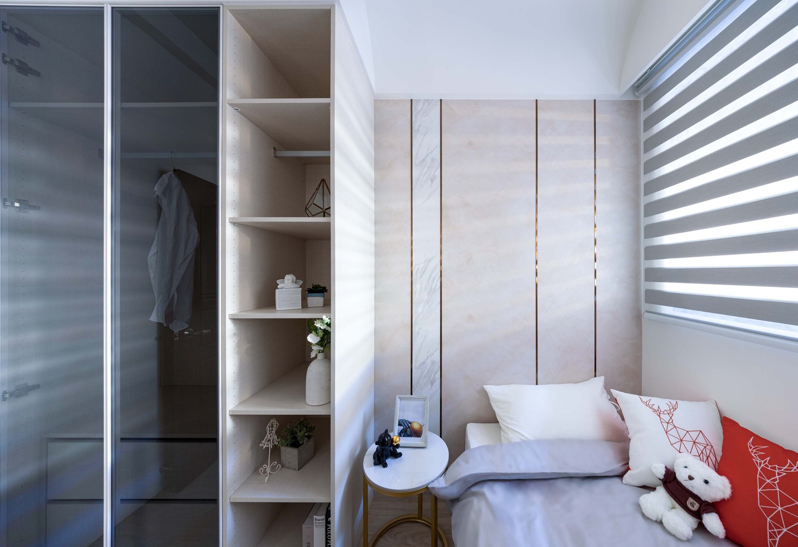衣櫃結合開放層架,兼顧實用與展示;書桌靠窗,保留光線流入的明亮感。