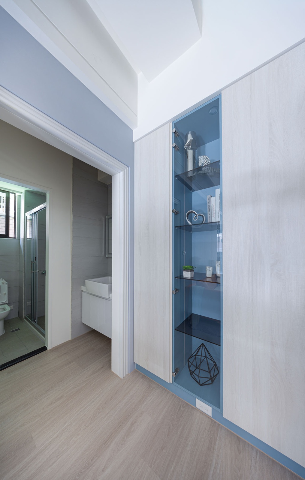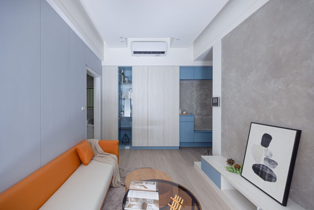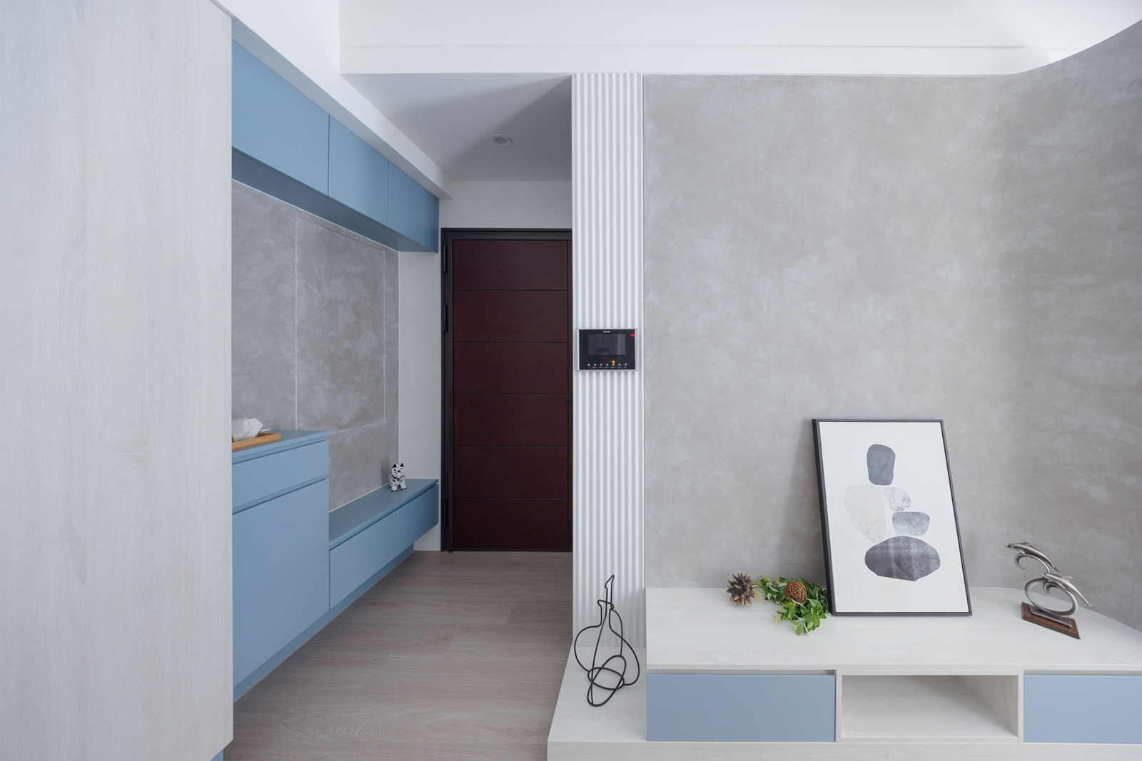 灰泥質感牆面結合藍色收納櫃,溫柔地修飾電箱線條,同時透出淡淡的生活氣息
