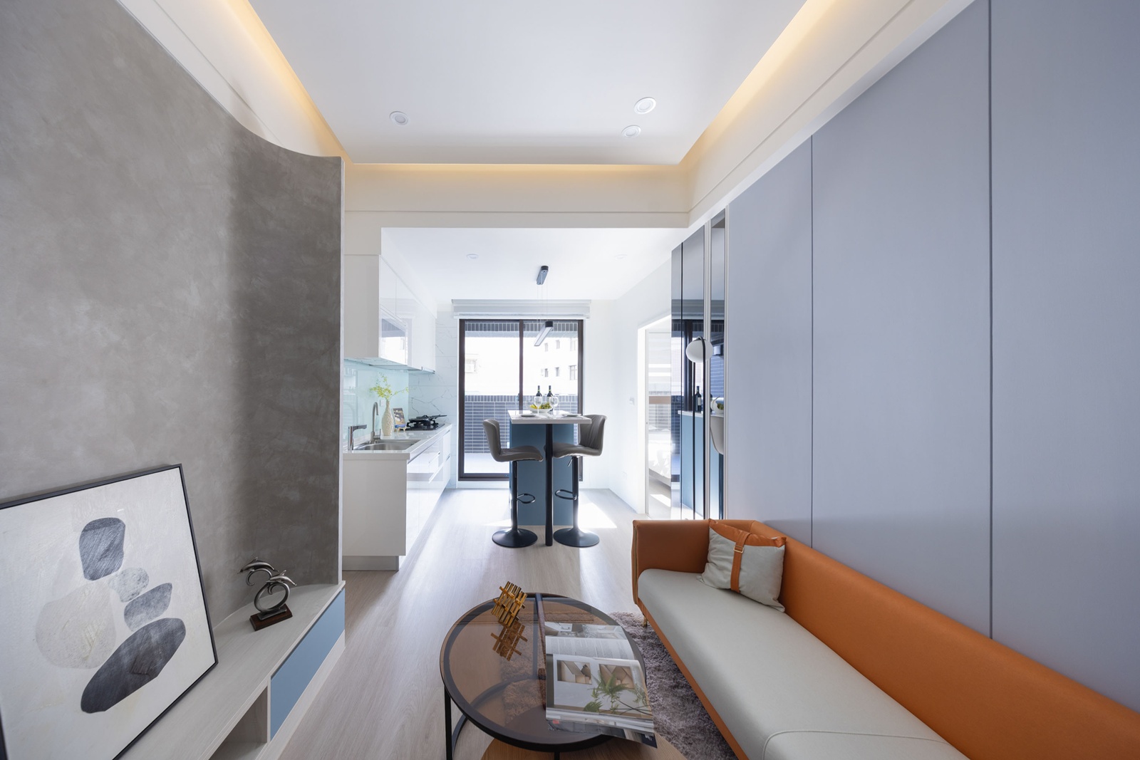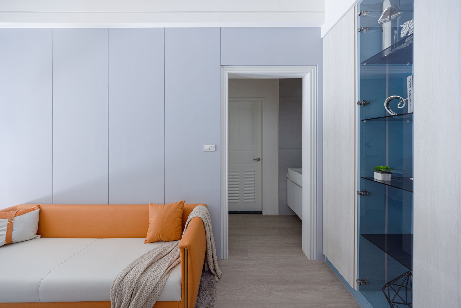 客廳以開放視野為主軸,整體以灰藍色與淡紫色牆面營造柔和氛圍,讓回家成為放鬆的儀式