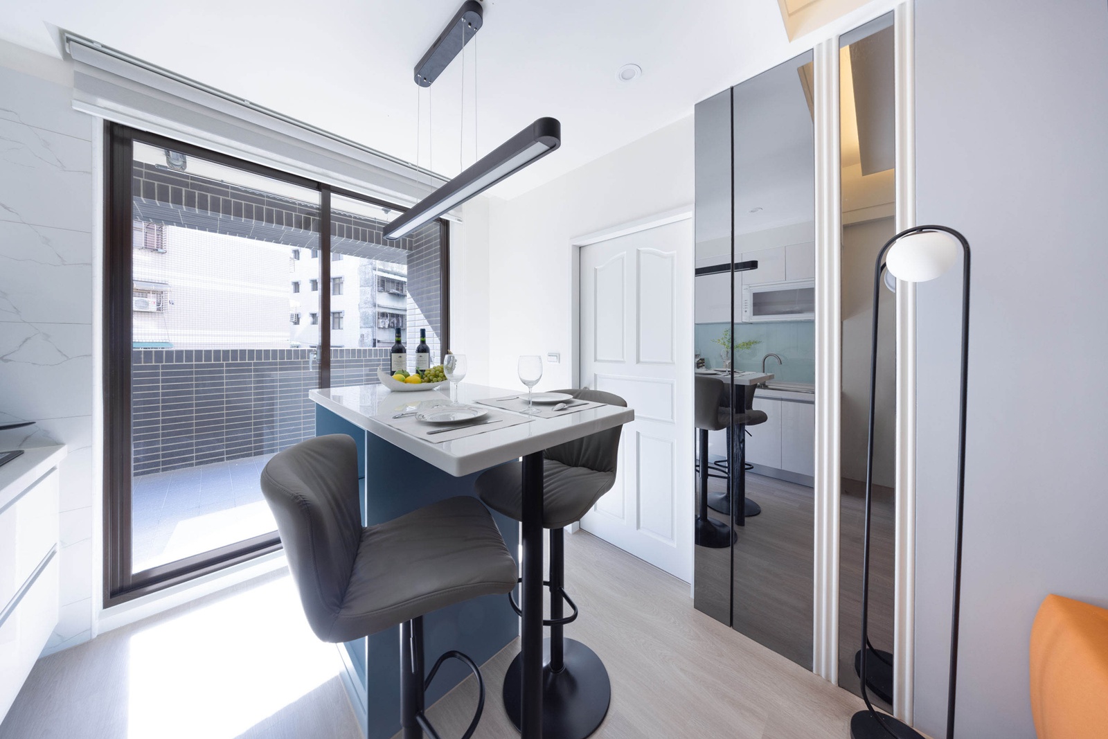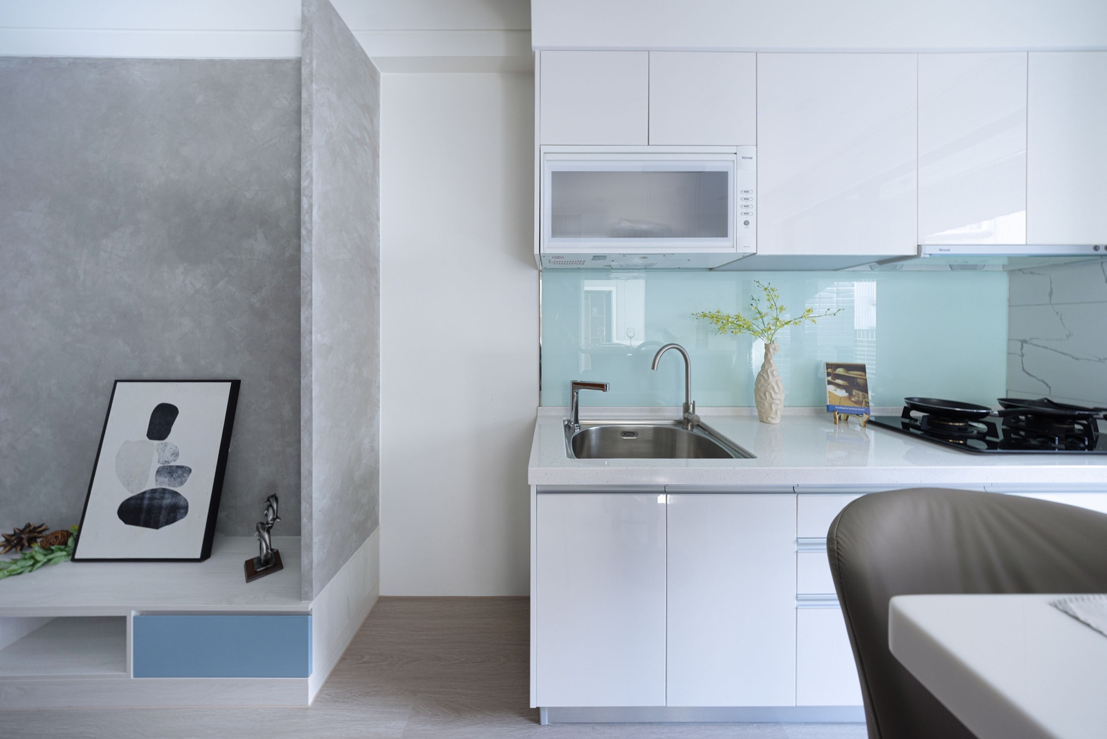 白色廚具搭配玻璃背牆,映照自然光影,讓整體空間明亮通透,也在日常中流露出細膩的生活美學