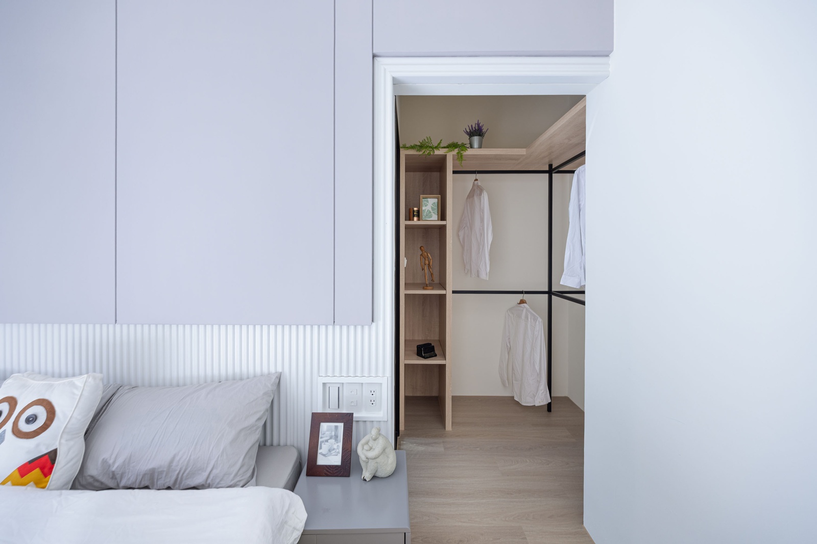 床頭牆以淺紫色為主調,融合溝縫造型與木格柵細節,在簡約中展現優雅層次