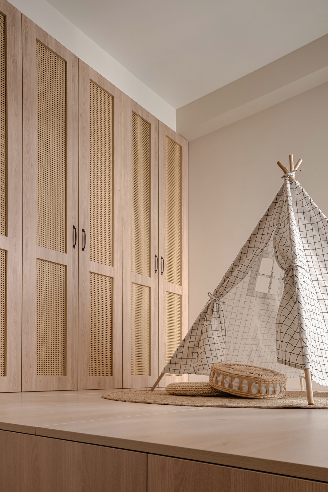 衣櫃門特別選用了客製化的藤編,編織出自然的呼吸感,讓空間更添溫潤與輕盈。