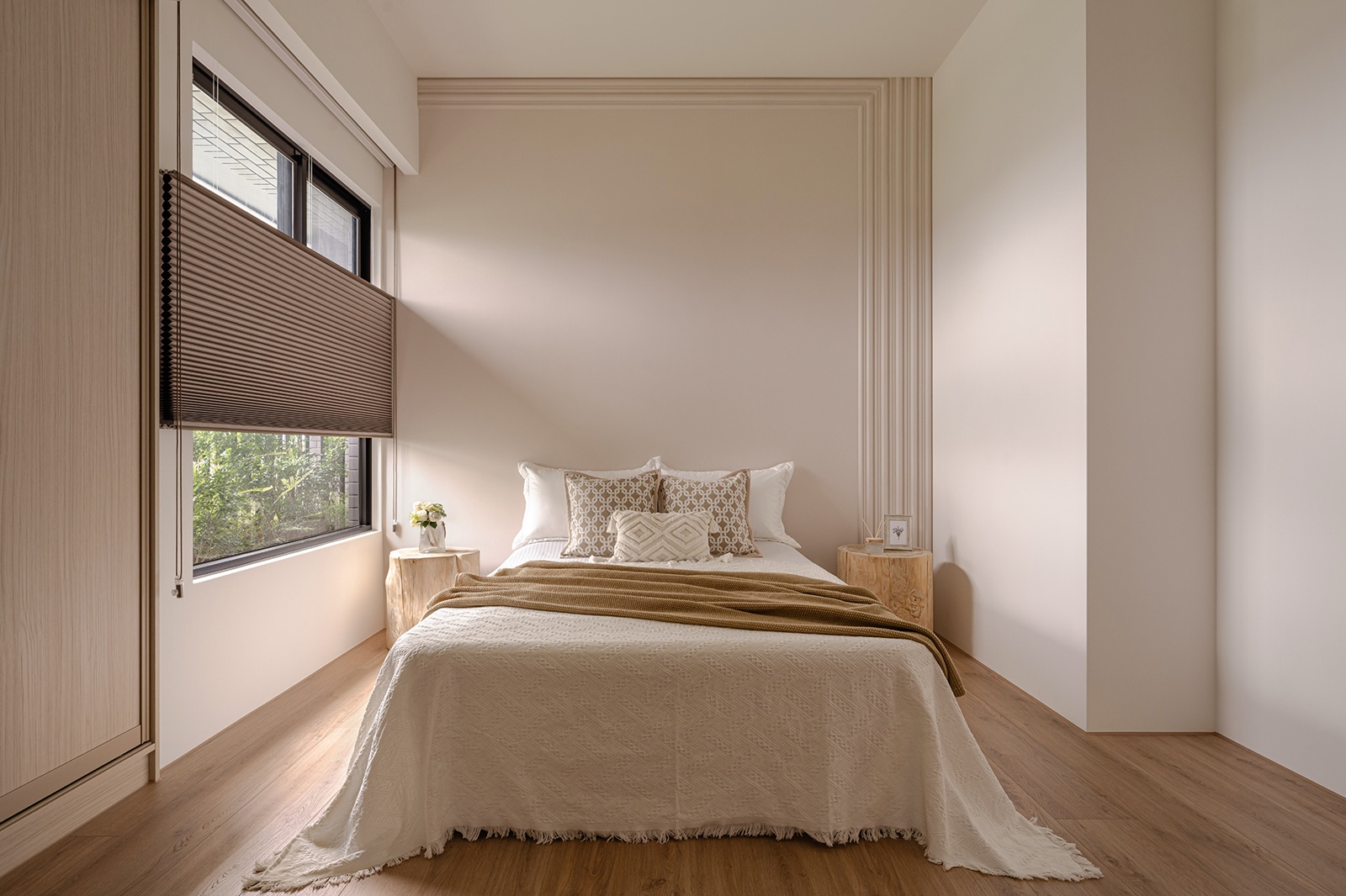 在主臥,牆面以珊瑚塗料鋪展,不只是視覺上的柔美,更蘊含功能性的安心守護。它能分解甲醛、除臭除溼,並具備耐燃特性,在美感之外,也為居住者築起一層無形的保護。