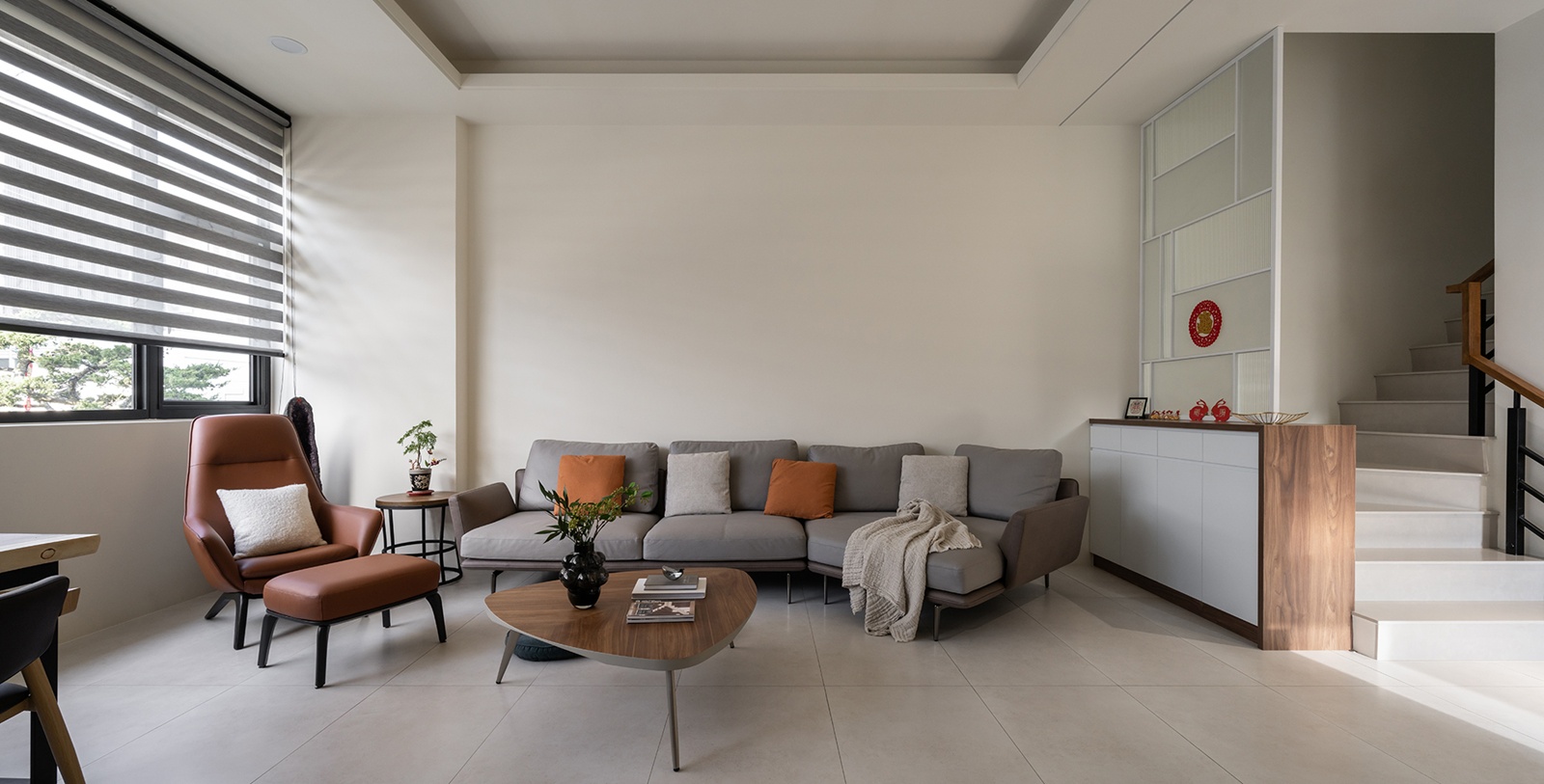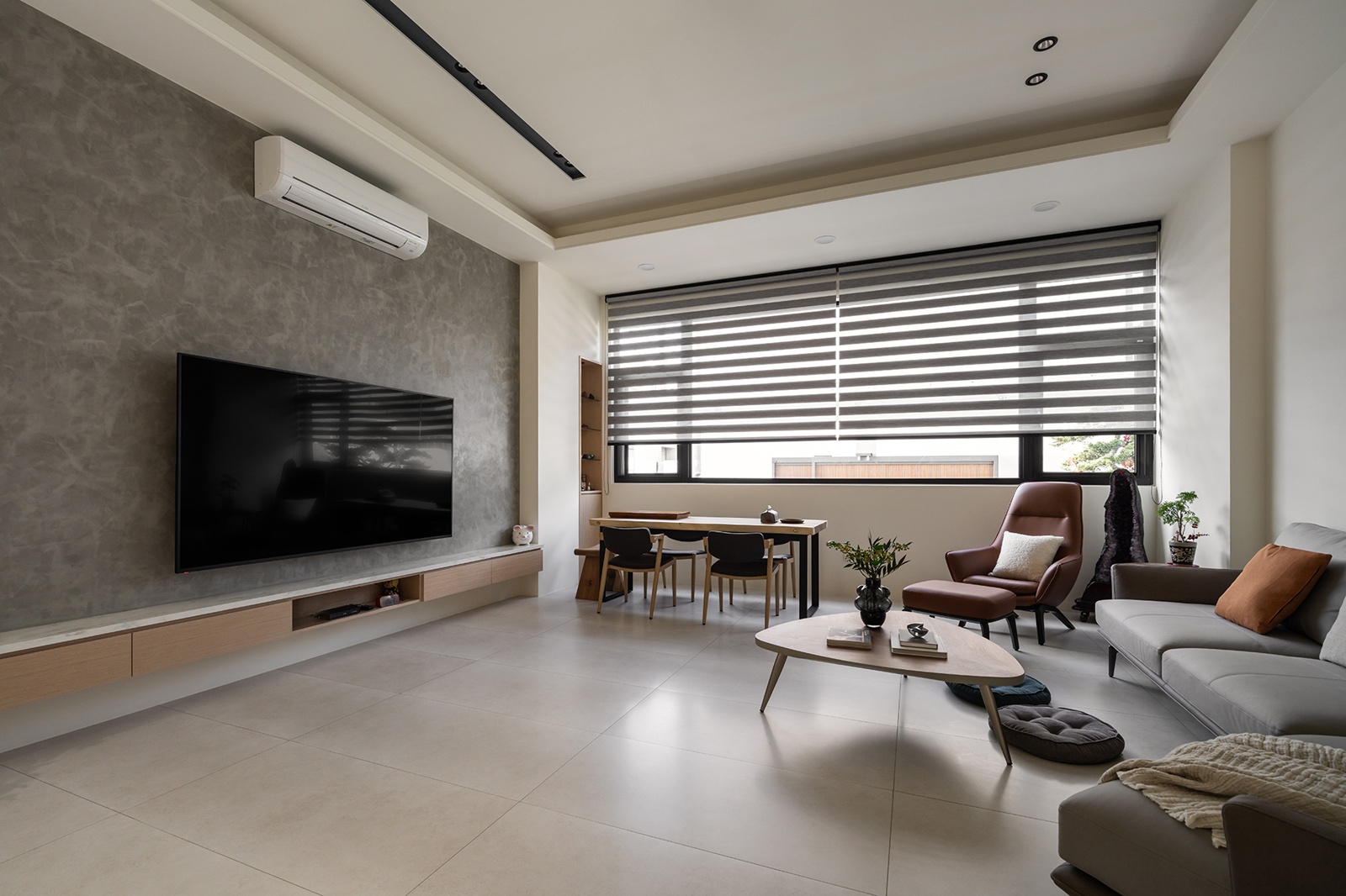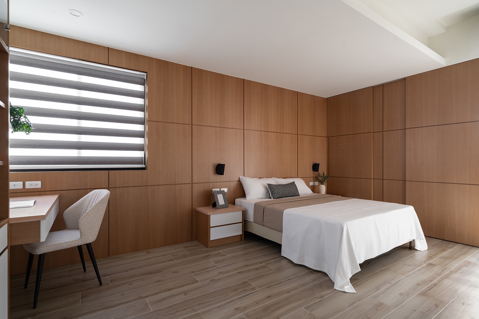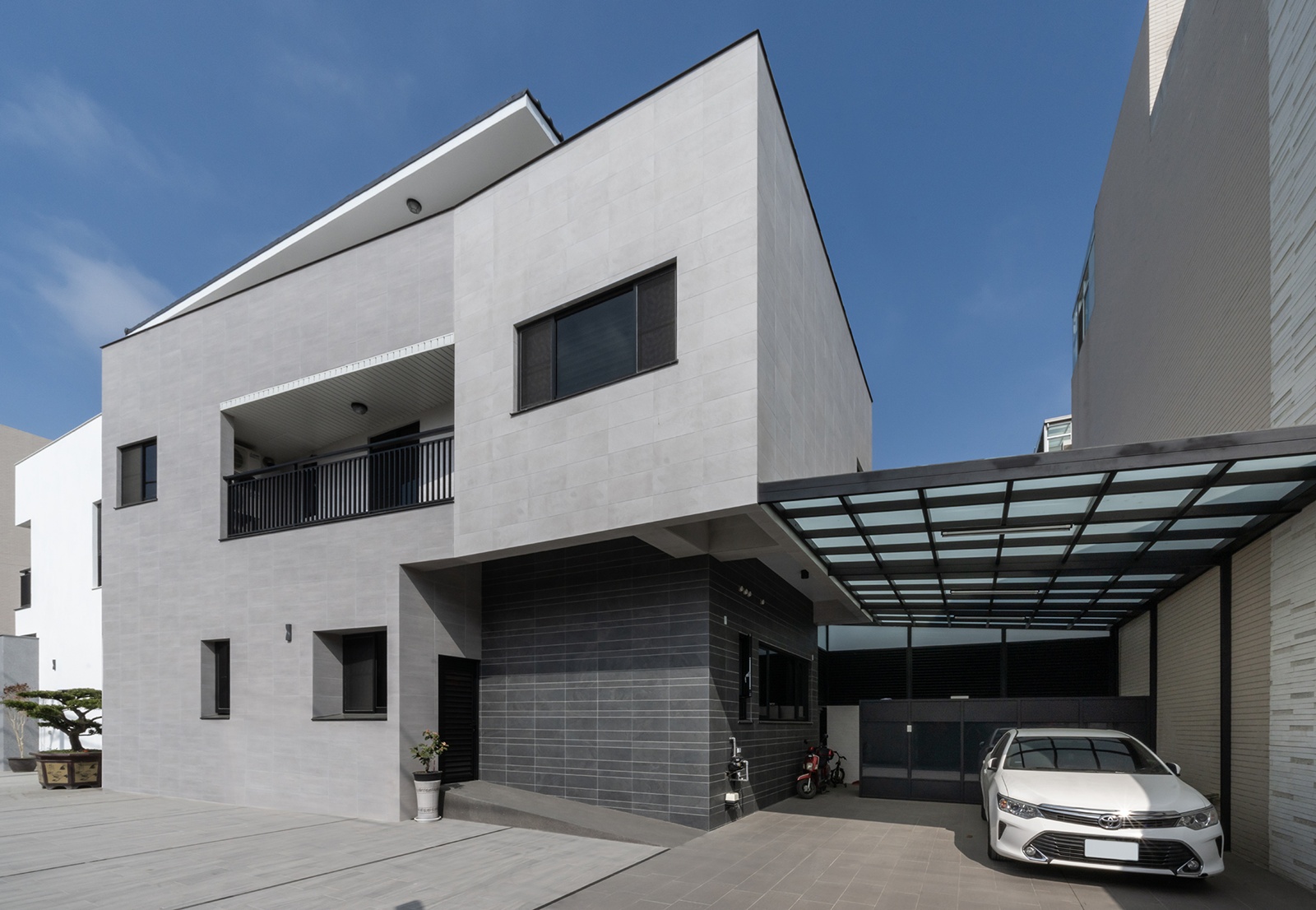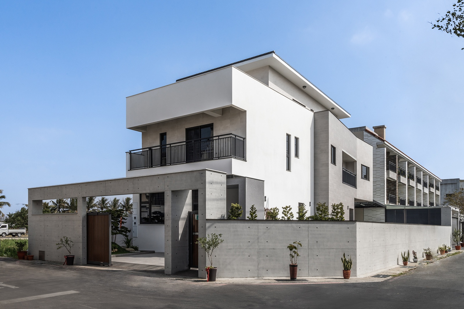 本案為三代同堂自地自建住宅規劃,基地寬廣且緊臨都市轉角。建築的部分:藉由退縮陽台及斜面造型、上挑斜面屋頂,讓長達三十三米的西向主立面有著匯聚光影及量體的韻律感;有效減輕西曬面陽光直射的缺點,並能於室內空間導向良好的通風採光,斜面的屋頂強化排水,適應近海地區多雨的氣候。室的部分:因應三代同堂的需求,在空間的配置上作了三代同處一屋卻不互相干預的動線。孝親房位於一樓,延著次動線配置,方便長輩獨立進出及臨近廚房。二樓以上除了四個房間之穿插著中介的共讀、嬉戲空間,作為生活中的緩衝。室內設計手法簡約,家具依據日照採光與開窗佈置,並採用低干預的建材,落實居住與環境友善。基地留設餘裕的空地比,廣植松木花草植栽綠意扶疏,不僅在視覺上能與室內空間相互借景,更能達到基地保水的目的,有利於都市氣候。本案運用基地特質,以策略佈局與材料選擇,實現局住效能、美約意趣與環境責任三者統合。