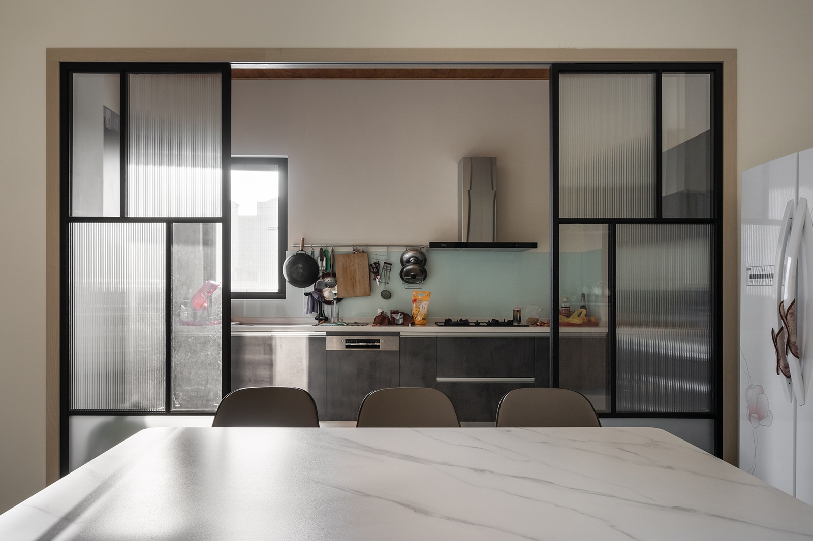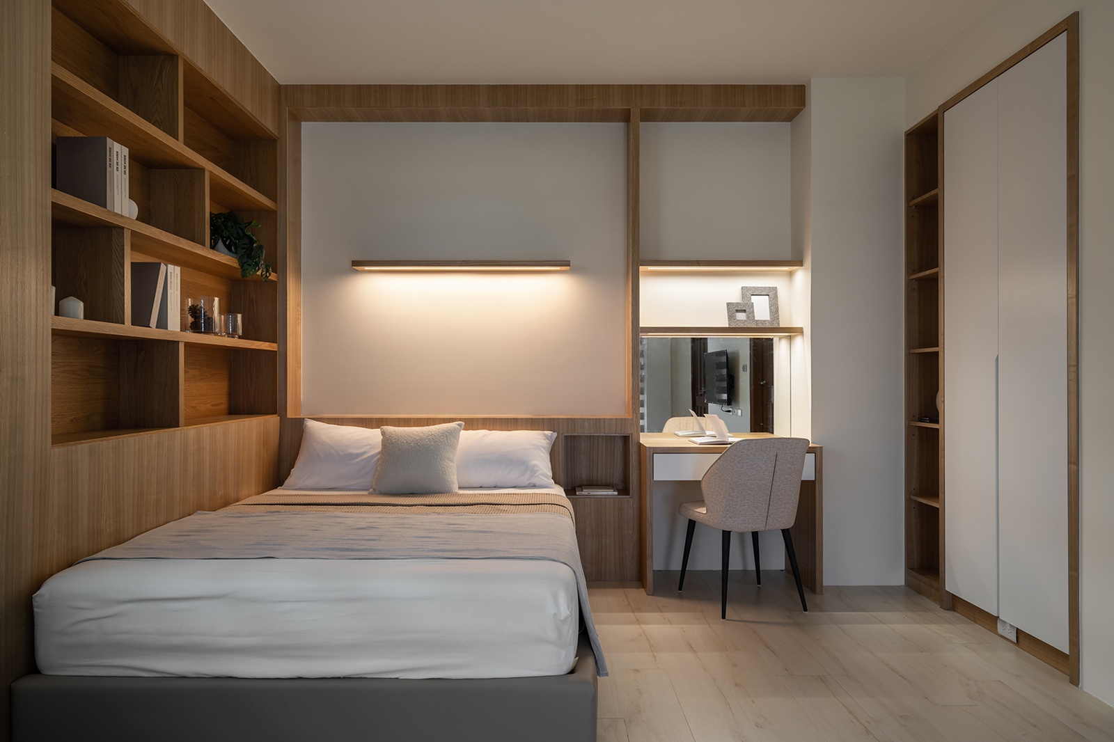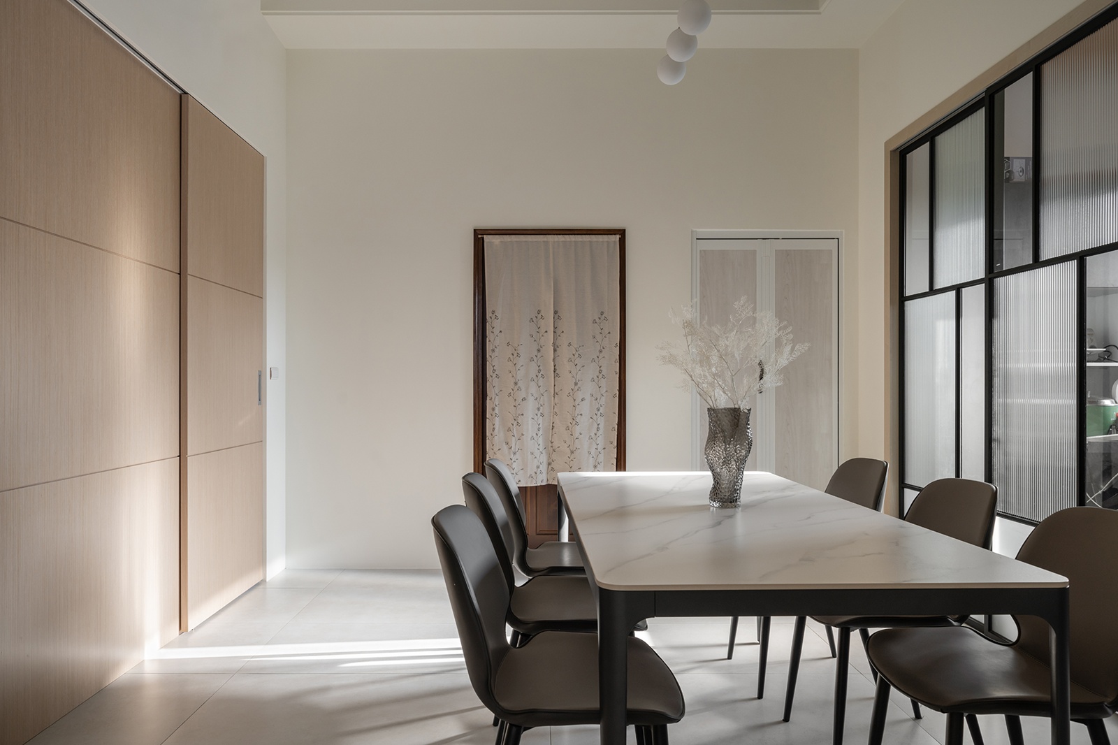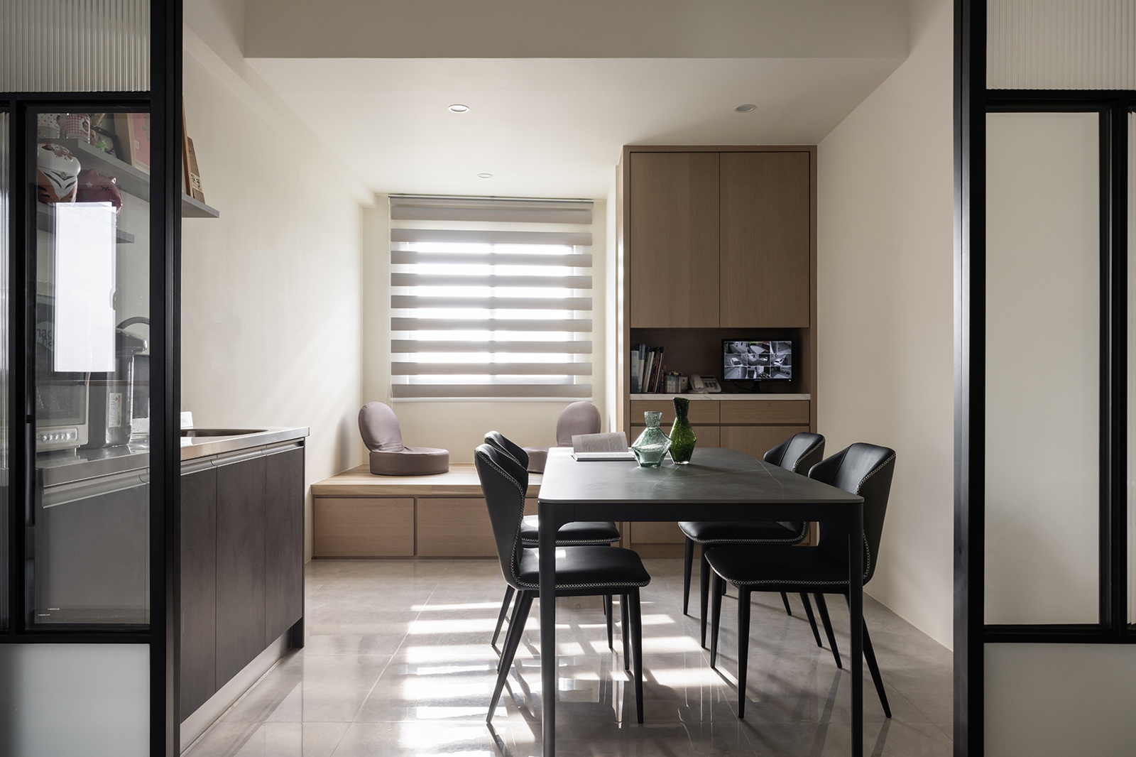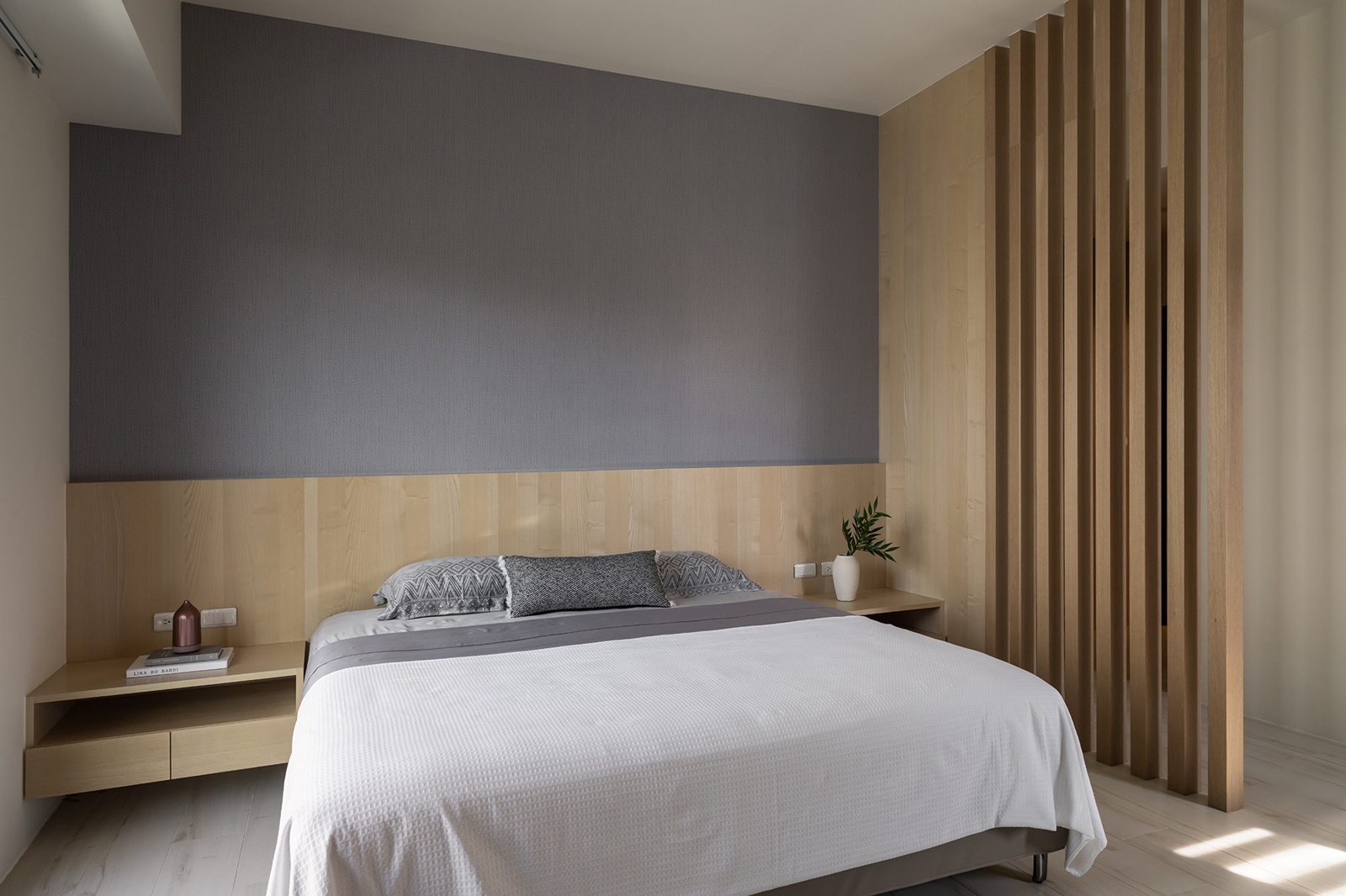 本案為三代同堂自地自建住宅規劃,基地寬廣且緊臨都市轉角。建築的部分:藉由退縮陽台及斜面造型、上挑斜面屋頂,讓長達三十三米的西向主立面有著匯聚光影及量體的韻律感;有效減輕西曬面陽光直射的缺點,並能於室內空間導向良好的通風採光,斜面的屋頂強化排水,適應近海地區多雨的氣候。室的部分:因應三代同堂的需求,在空間的配置上作了三代同處一屋卻不互相干預的動線。孝親房位於一樓,延著次動線配置,方便長輩獨立進出及臨近廚房。二樓以上除了四個房間之穿插著中介的共讀、嬉戲空間,作為生活中的緩衝。室內設計手法簡約,家具依據日照採光與開窗佈置,並採用低干預的建材,落實居住與環境友善。基地留設餘裕的空地比,廣植松木花草植栽綠意扶疏,不僅在視覺上能與室內空間相互借景,更能達到基地保水的目的,有利於都市氣候。本案運用基地特質,以策略佈局與材料選擇,實現局住效能、美約意趣與環境責任三者統合。