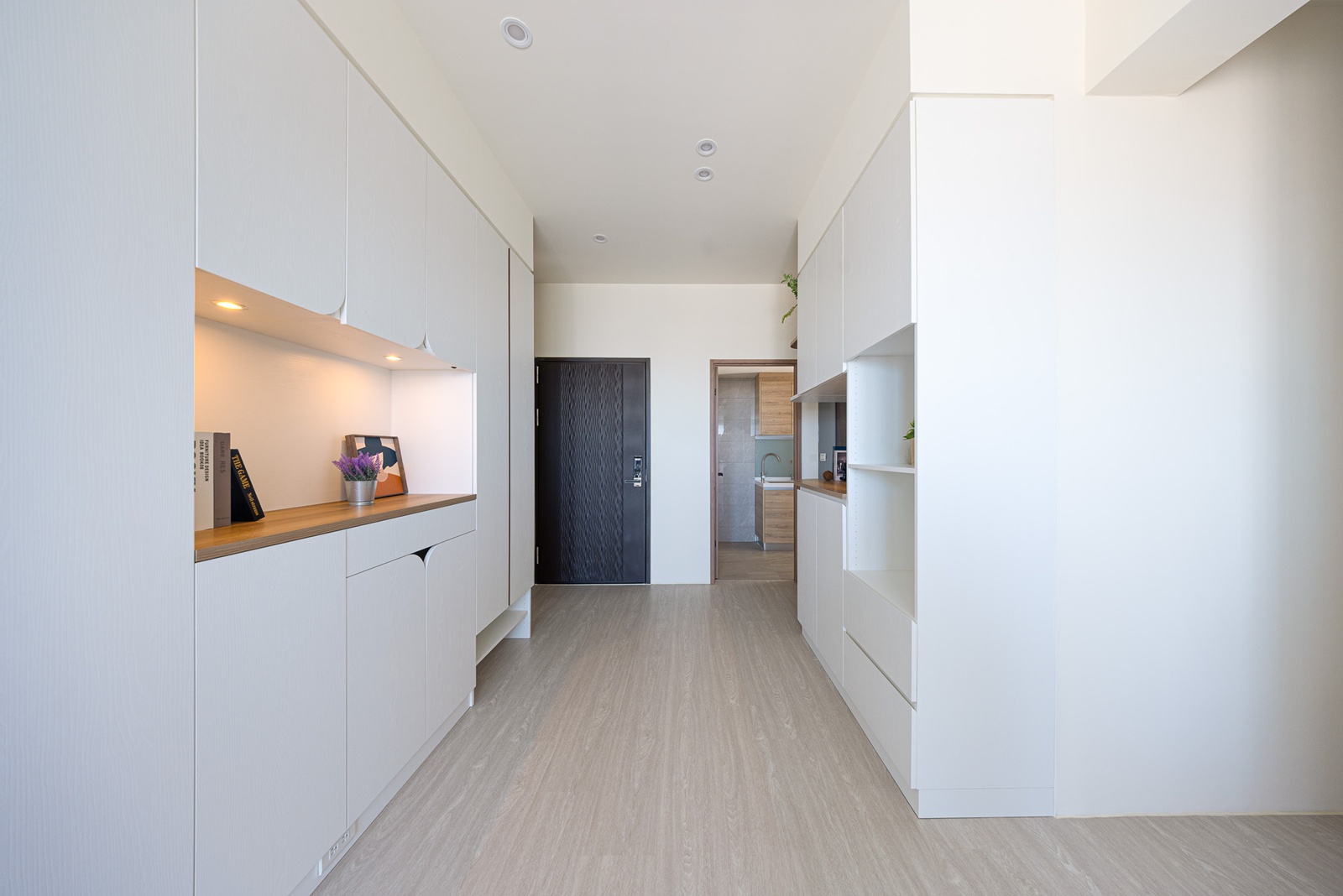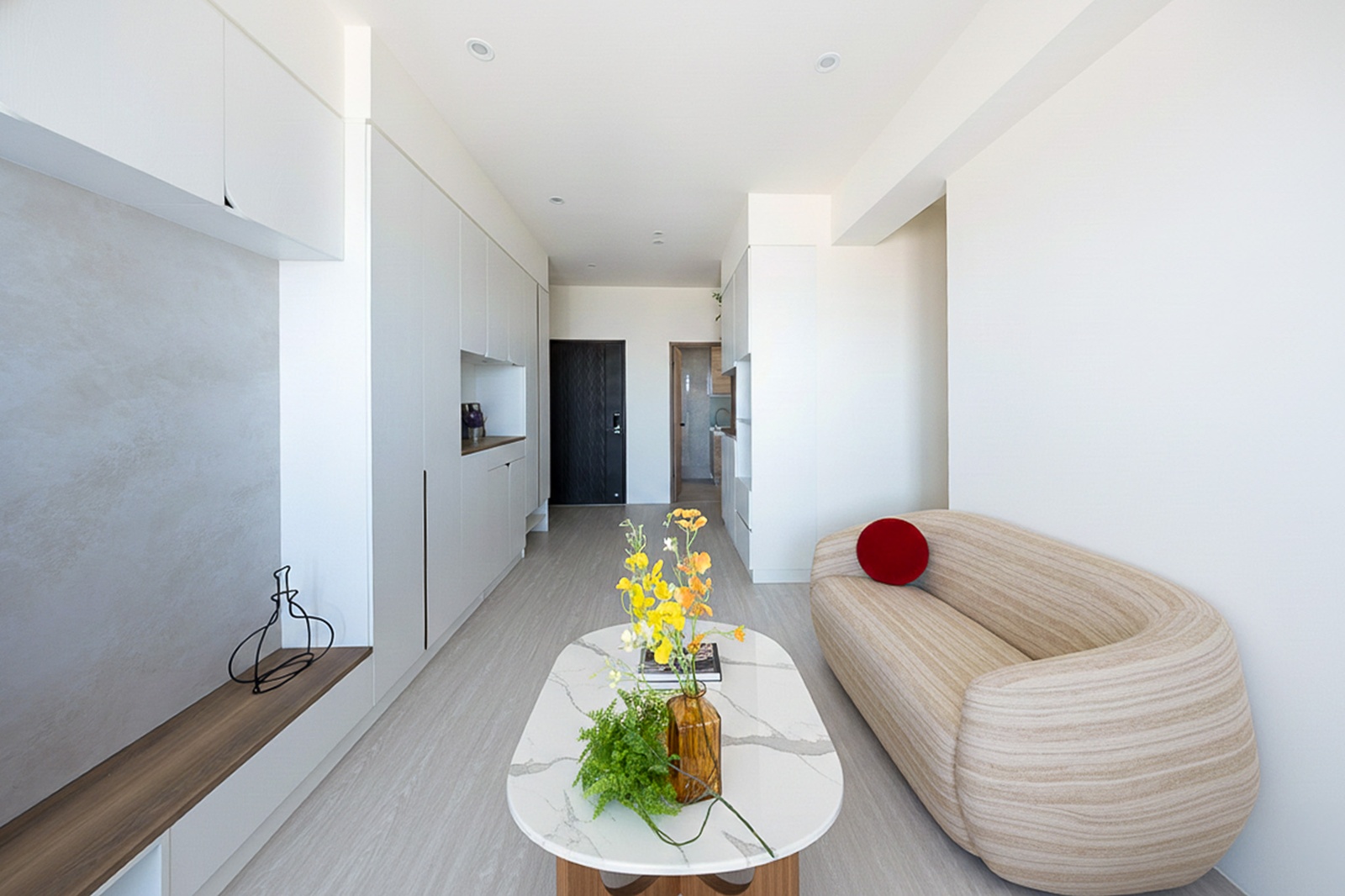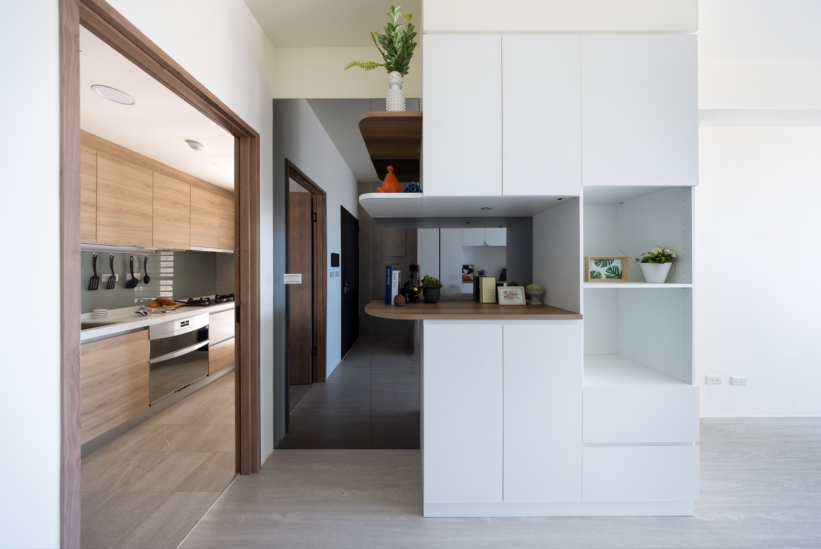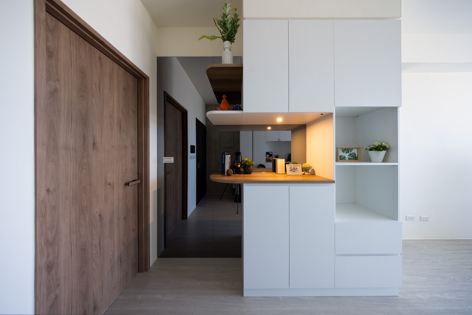 圓弧門片取代銳角,柔化線條之餘,也為回家的第一眼注入一份柔和的節奏