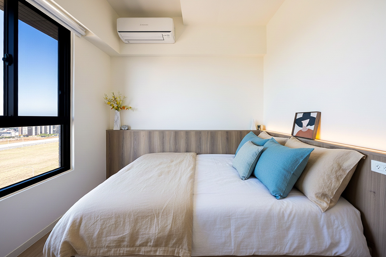床頭牆以日式語彙構築,以自然肌理與中性色鋪陳靜謐氛圍