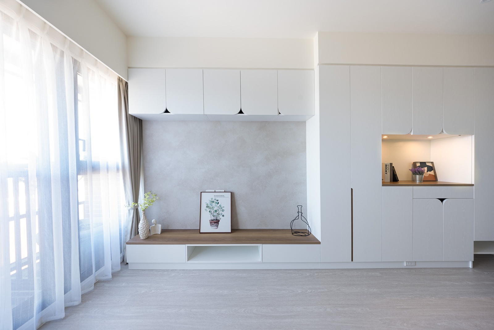 整體以白為底,延伸至電視上櫃與收納櫃體的整合設計,線條俐落、比例克制
