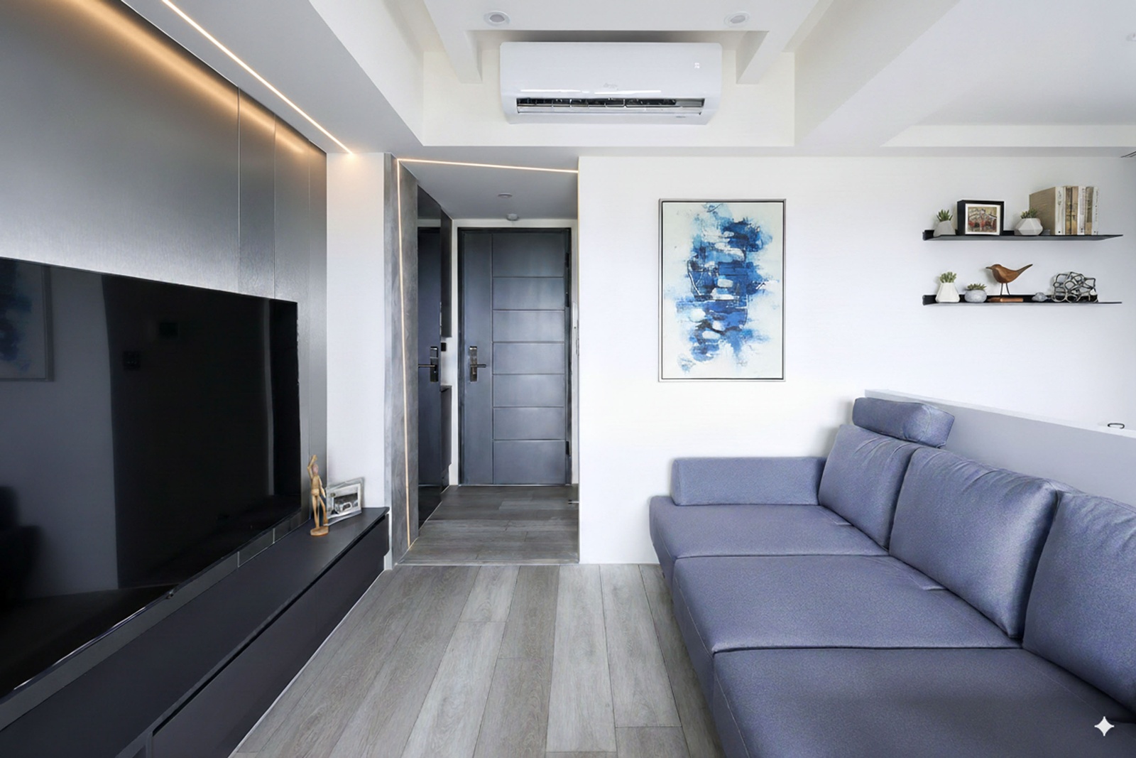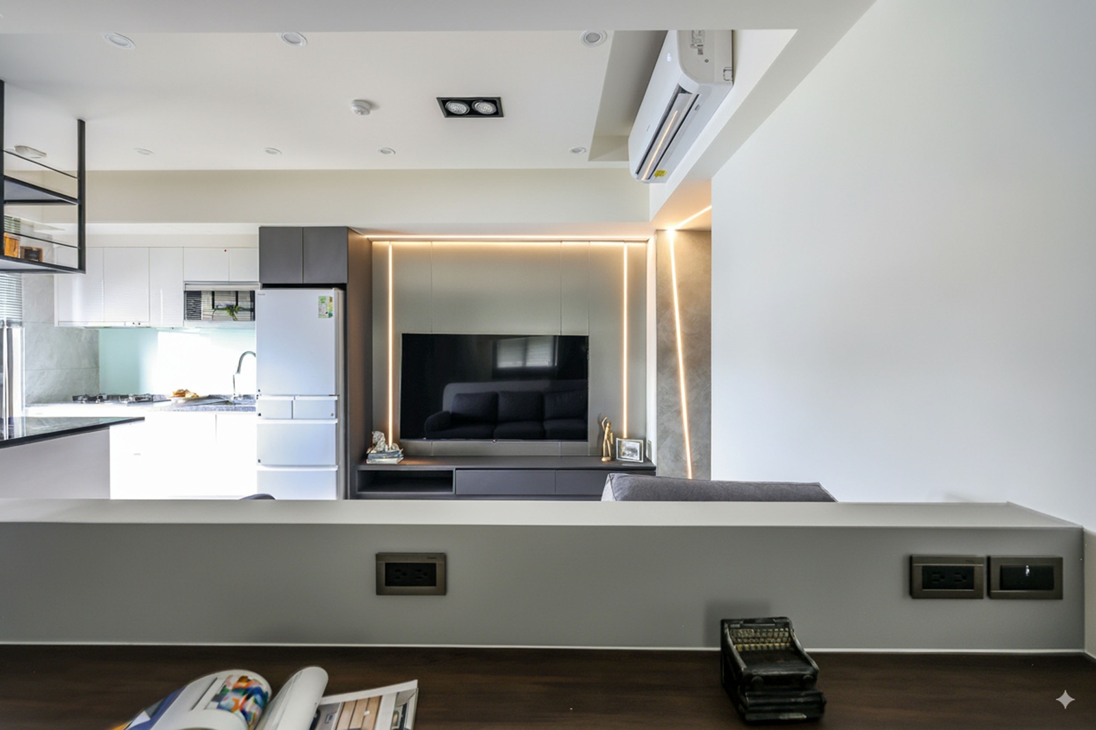 電視牆溝縫設計,強化俐落氛圍,搭配上方的線燈,在夜晚投射出微醺般的光影,成為男主的視覺饗宴