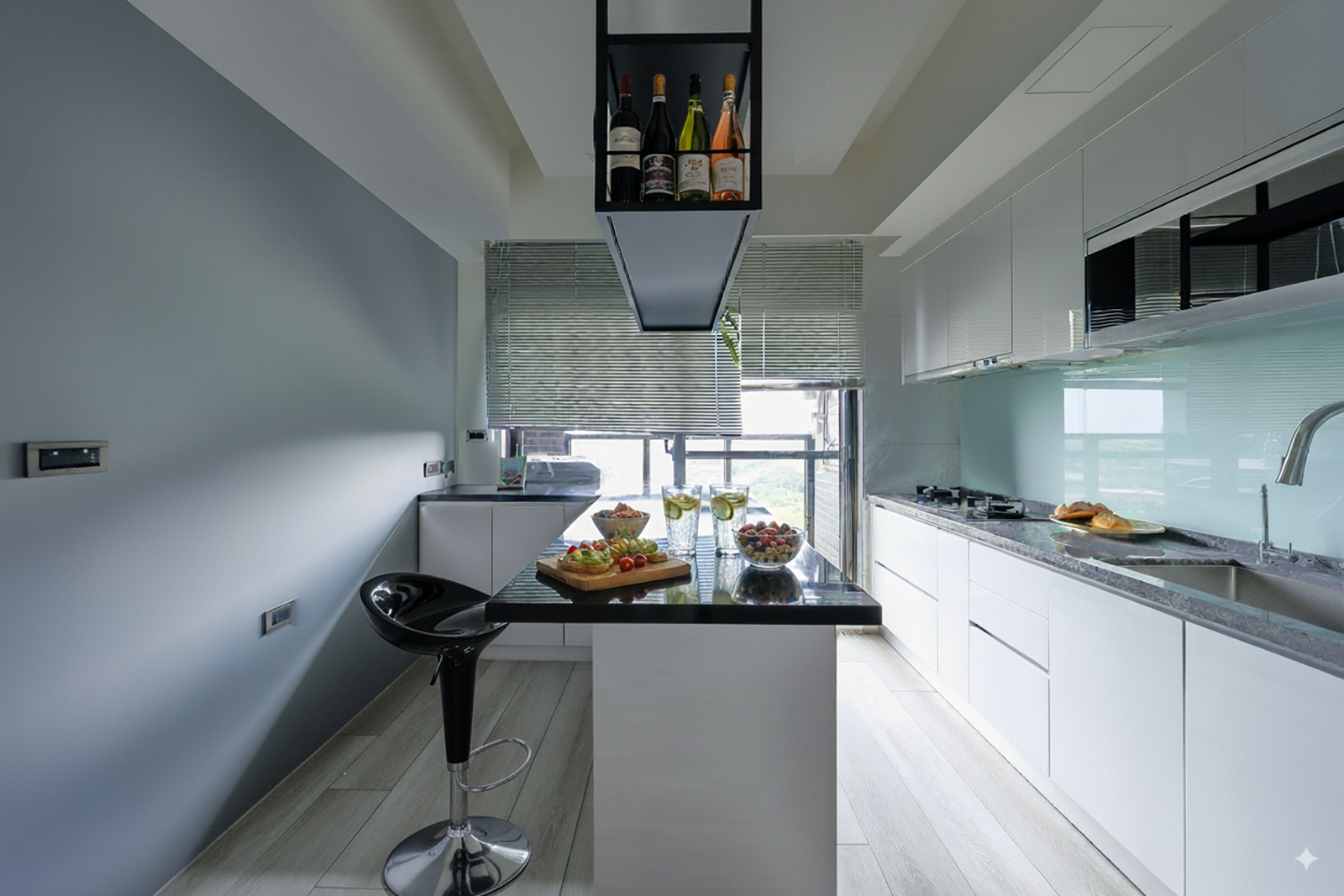 深色吊櫃陳列著酒杯與佳釀,搭配吧檯高腳椅,勾勒宛如私人酒吧的氛圍