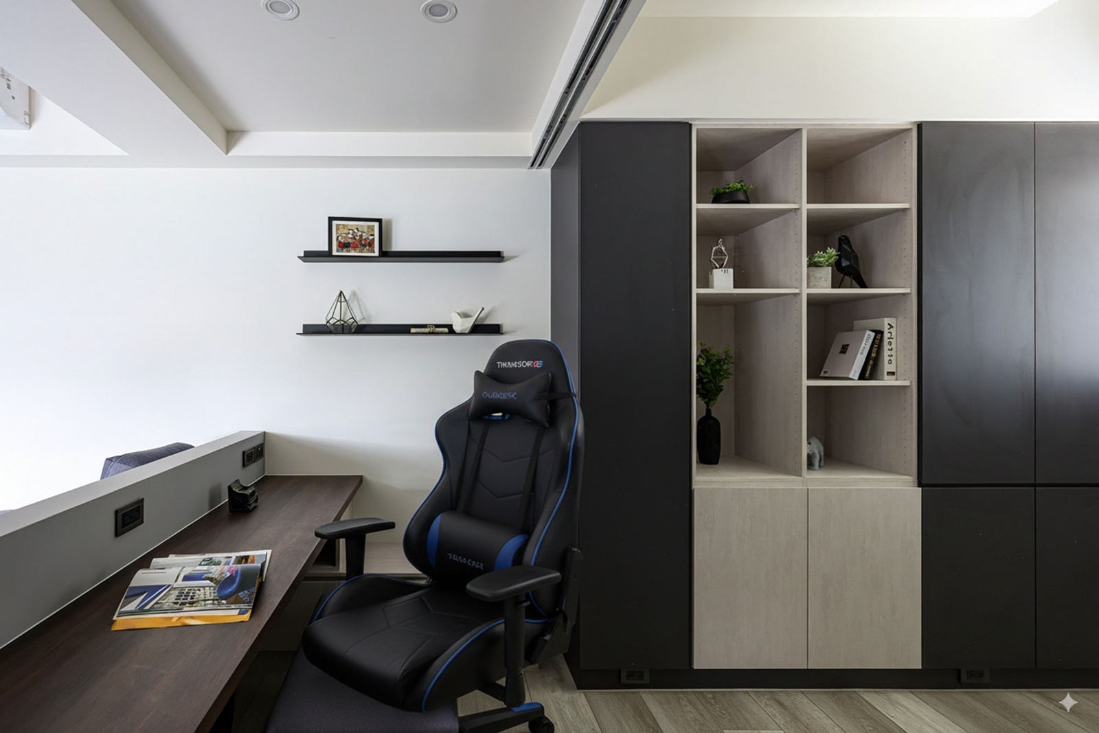 胡桃木書桌沉穩內斂,鐵件層板展示書籍與收藏,後方的系統收納櫃提供日常物品的儲物空間,讓書房承載著主人的書香氣息。
