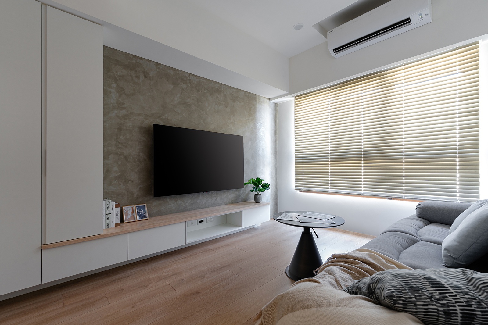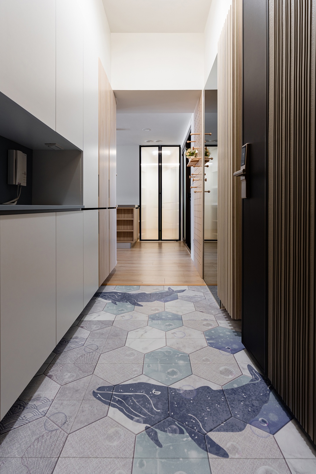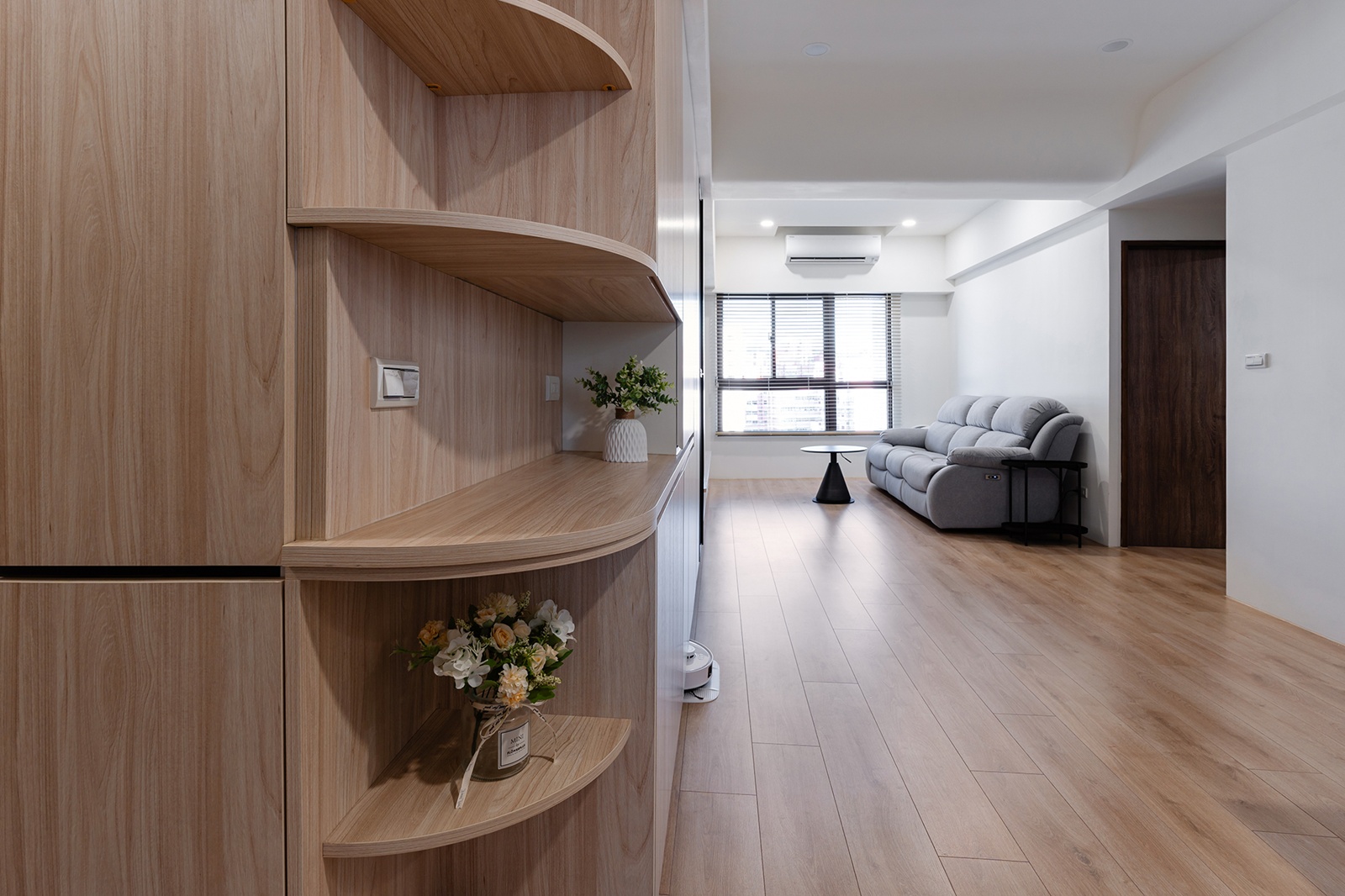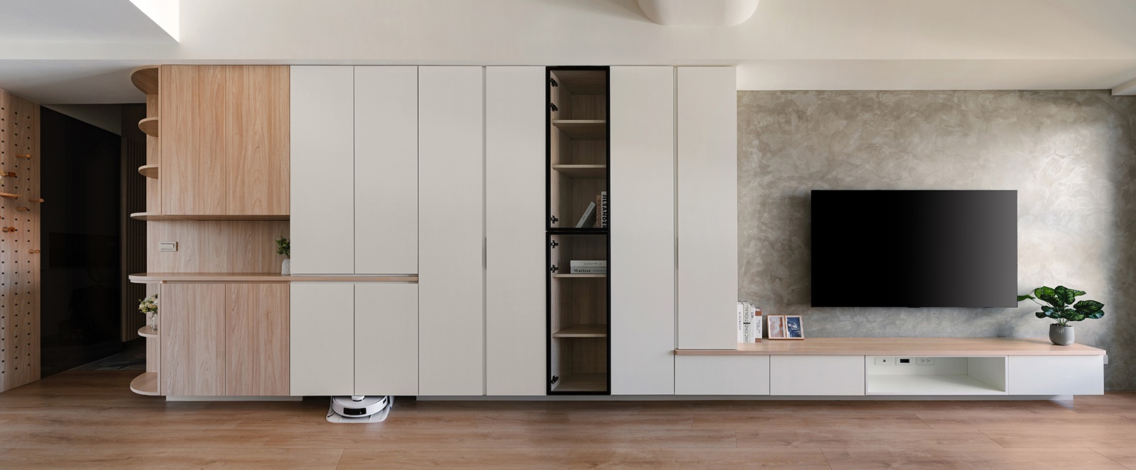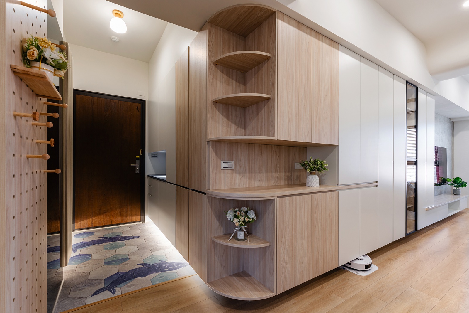 Home » Professional » 鯨迎暖居 描述 采紘室內裝修工程有限公司 鯨迎暖居 房屋坪數20坪 個案風格現代風、簡約風 個案屋型 小坪數 個案屋況 空間格局 主要建材洞洞板、灰玻、鋁框玻璃門、弧形天花板 本案為室內住宅設計案,團隊運用系統櫃整合收納,提升小坪數的使用效率。設計採弧形天花,搭配暖白與原木色調,鋪陳溫潤且療癒的居家景致。玄關以鯨魚圖樣揭開入室節奏,將「海中幸運之神」寓意融入家中。踏入其中,柔光與祝福輕柔環繞,幸福與美好靜靜於此生息。 Example Title 其他作品 查看內容 鯨迎暖居 查看內容 柔暉映暖
